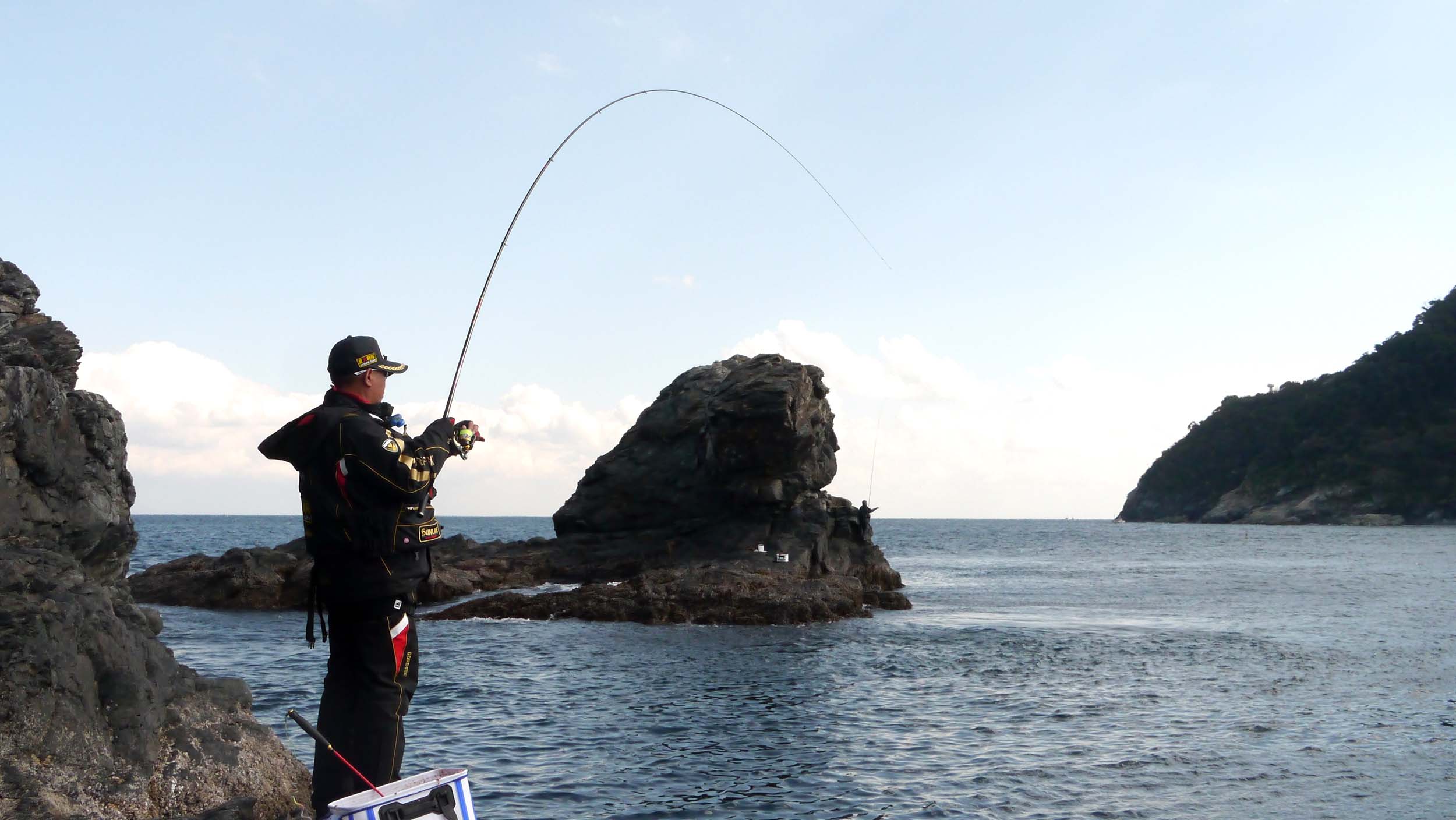 まずは鶴見の"テッポウ”へ5人で上がって、グレやイシダイ・カンダイ・イスズミなどを釣りました。正午の瀬替わりで、サッシーや木村君の本体に本命潮が流れる“テッポウ”を譲り、3名になった私たちは“押出の大バエ”に瀬替わりです。