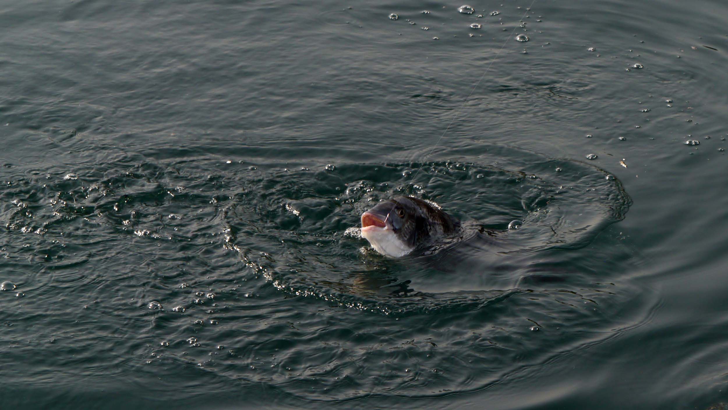 12時からは“千畳敷”での釣りでしたが、3ヒロ~竿1本半くらいのタナで、道糸を引っ張るアタリです。30㎝級を2枚リリースし、40㎝くらいから47㎝位のグレを5枚ほど取り込むことが出来ました。