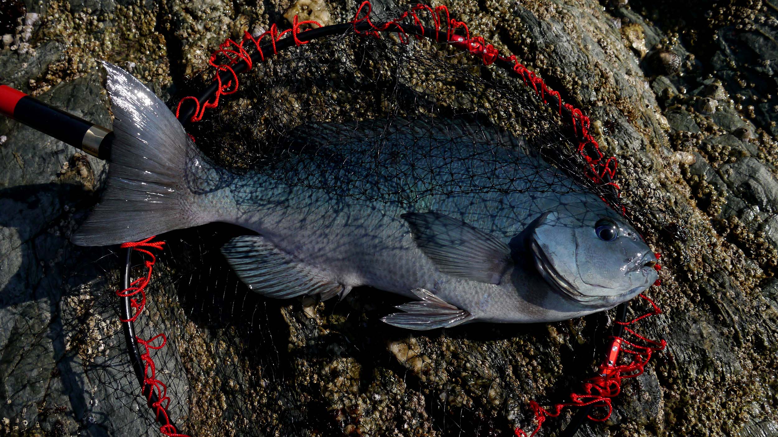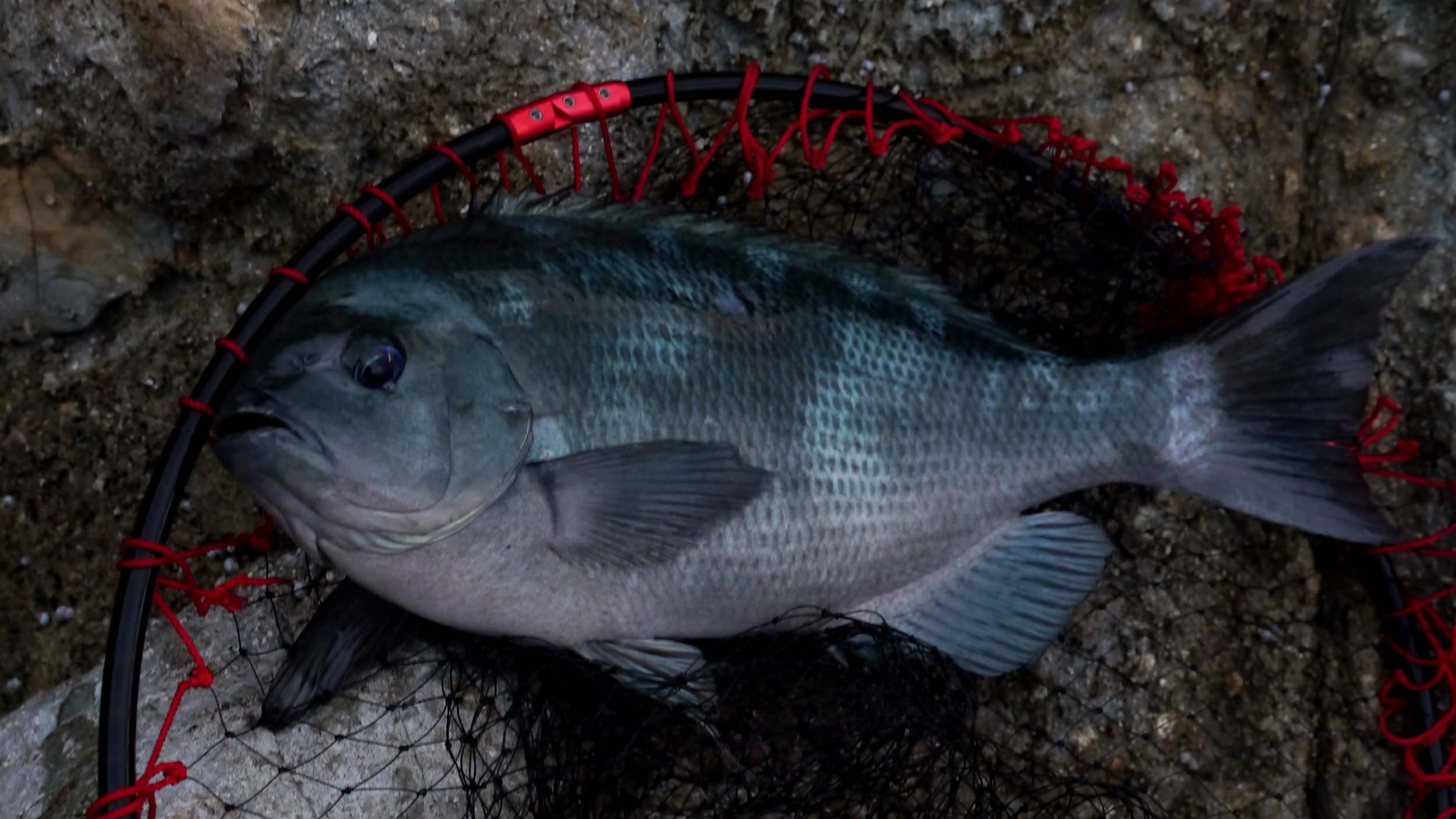 足元がうっすらと明るくなった6時30分頃、2ヒロに変えた水中のケミホタルが横移動、またキンギョかと思って軽く合わせた瞬間、重量感のある最高の引きに遭遇。3号ハリスと2号ロッドに物を言わせ、一切の送り込みをせずに、優勝魚のグレを取り込んだのです。