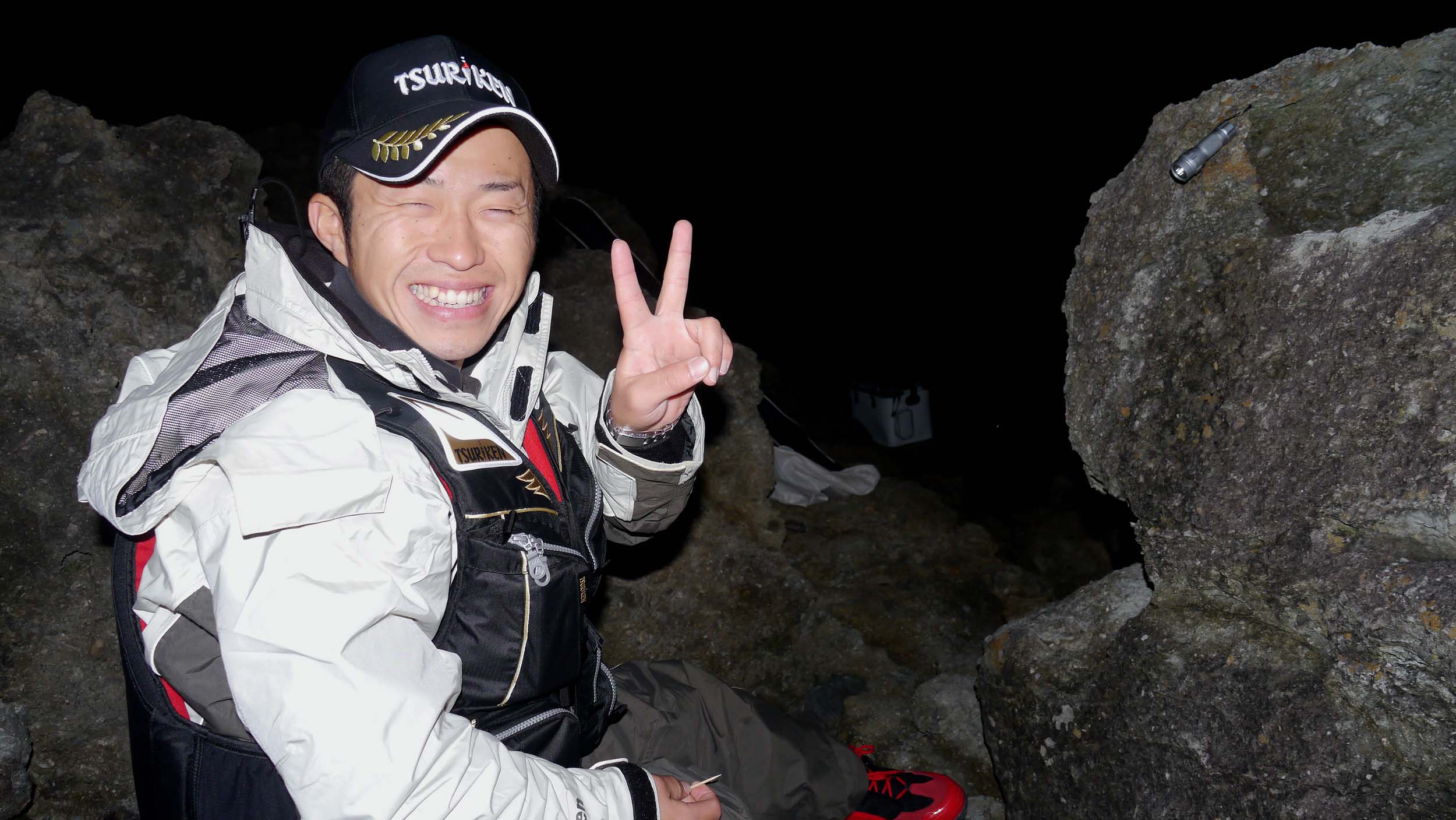 夜釣りの狙いは、岩から1mが私の基本。底であれば底から1m以内。磯際であれば磯際の岩から1m以内。沖の沈み瀬であれば、沈み瀬から1m以内にマキエとサシエを同調させながら仕掛けを流すのです。