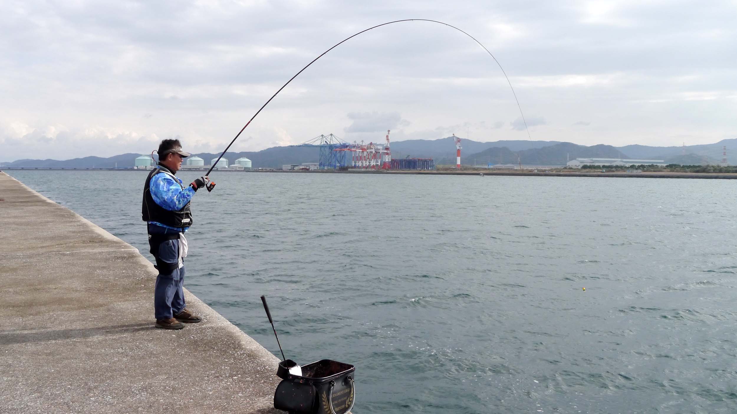 釣り講義中でチヌを掛け、やり取りの説明