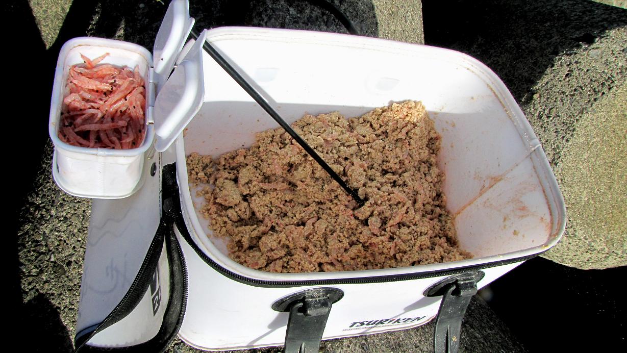 NKFトーナメントでエサが少なかったので、マキエを打ちながらフカセ釣りでチヌかマダイを狙いつつ、マキエが効いた頃に集中してカンダイを狙う作戦です。