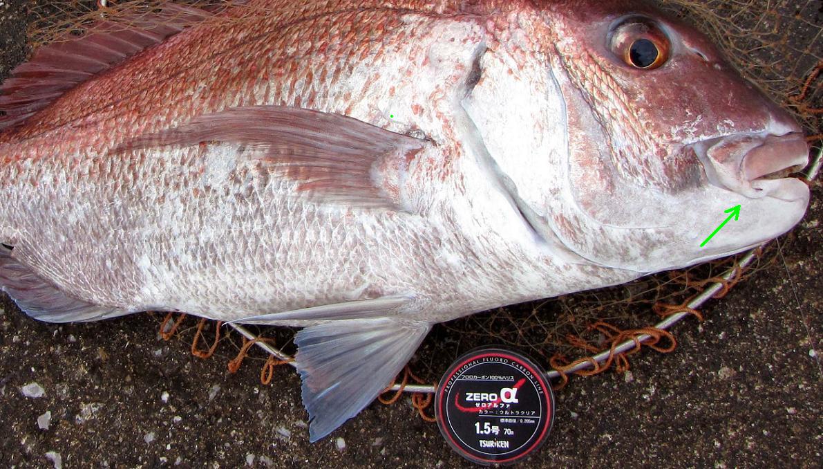 手に持った写真は夕方に撮ったものですが、釣れたのはお昼の13時過ぎ、マダイは逃げ方が下手なので、取り込める確率の高いお魚さんです。この日は縦一文字でも同型が釣れていました。