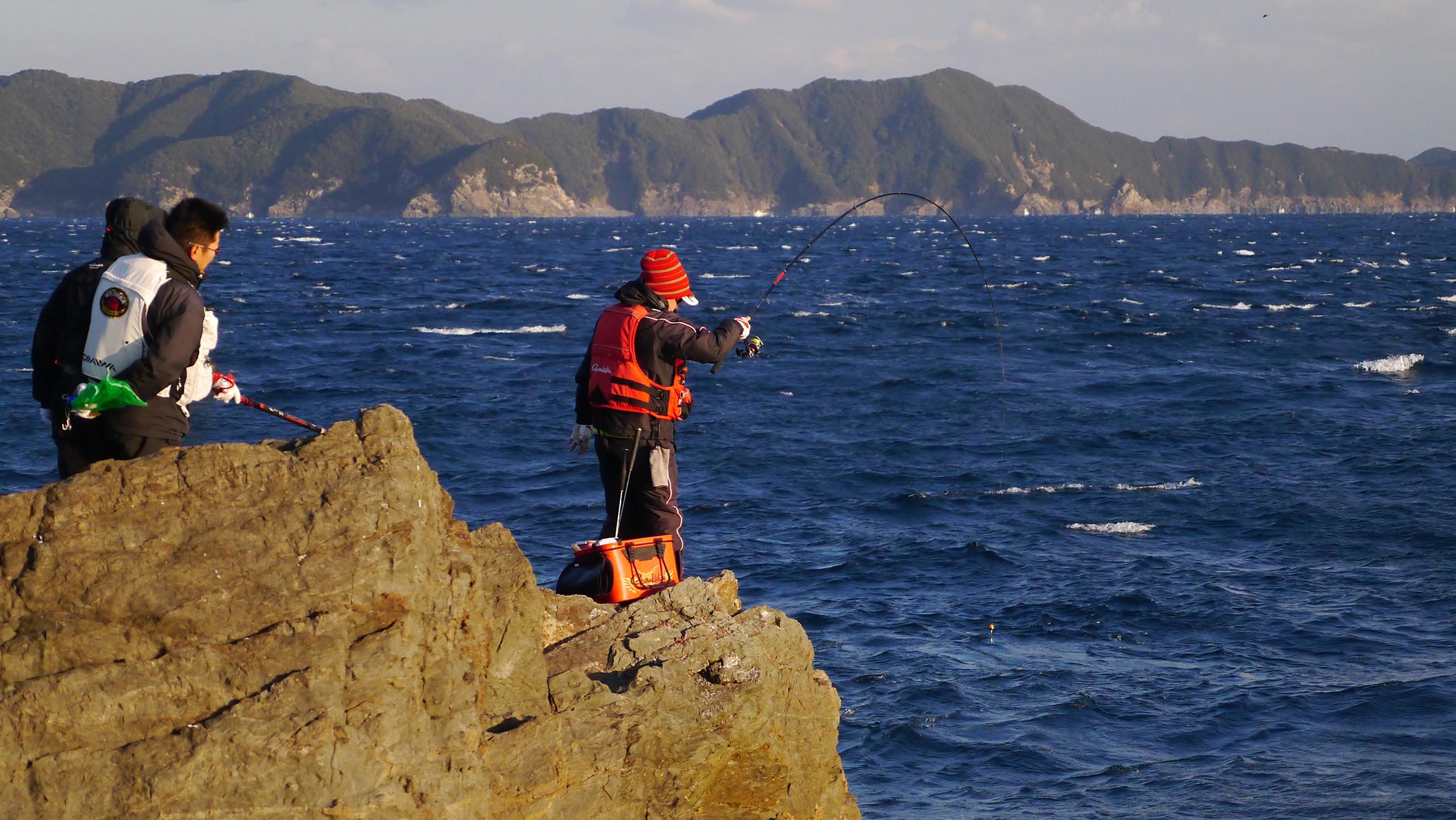 折からの西高東低の気圧配置で"沖の観音”は北西風が強く、いつもの船付き周辺の足場は斜め前からの強風が吹き荒れる一日で、非常に釣り難い状況でした。そんな中、東の先端とその横の足場の低い場所だけは、追い風なので良い釣果に恵まれました。