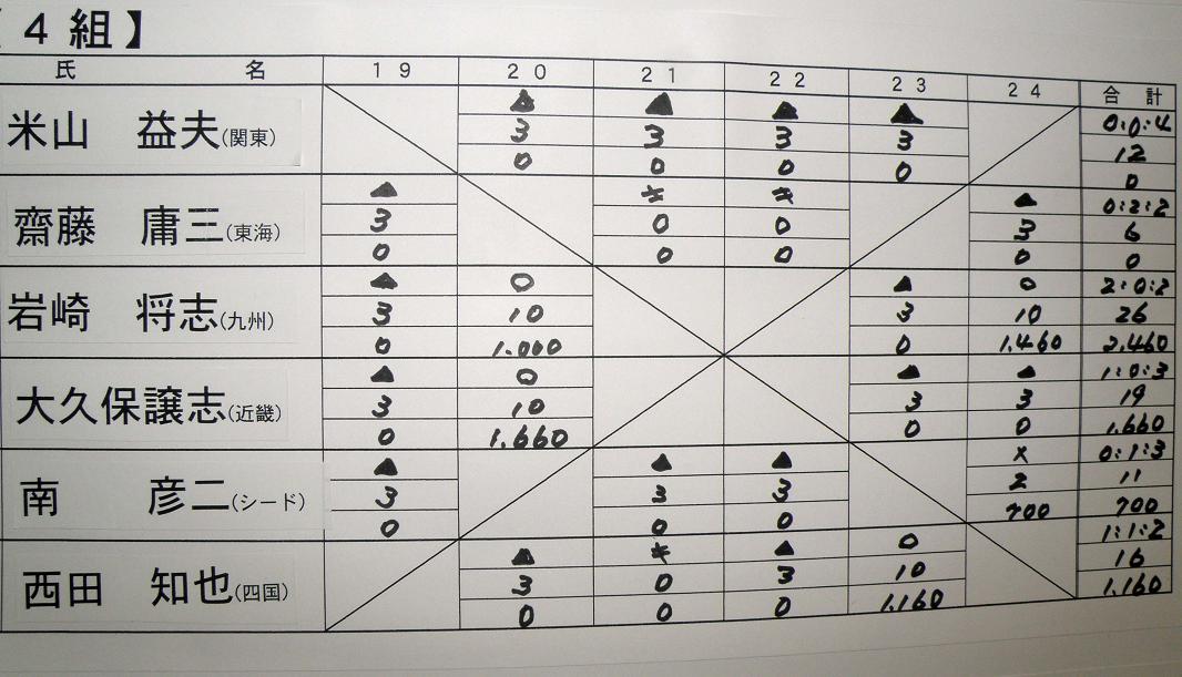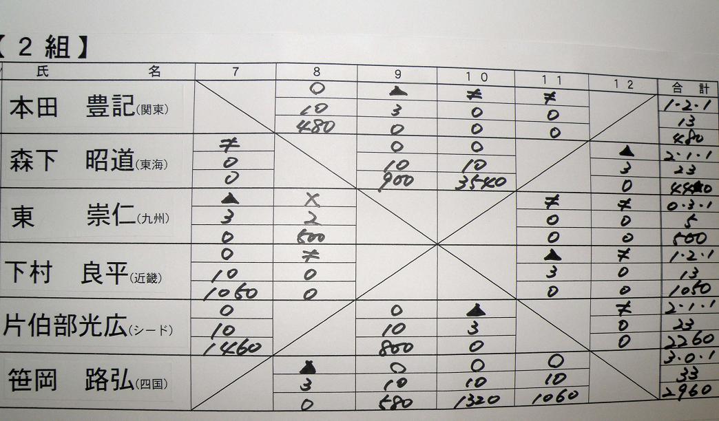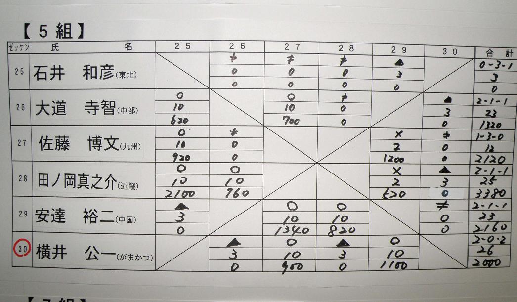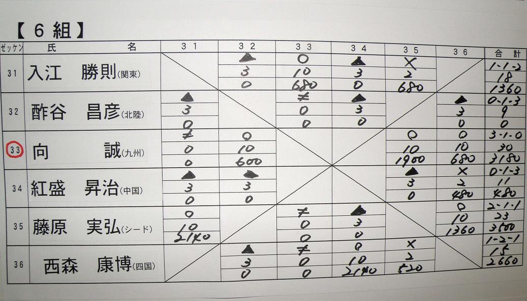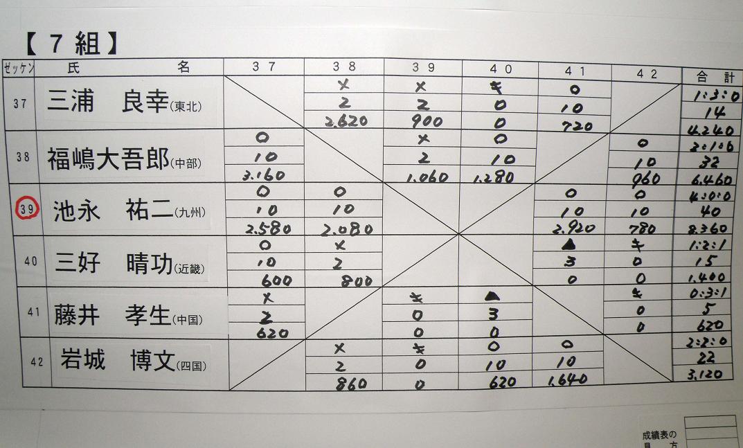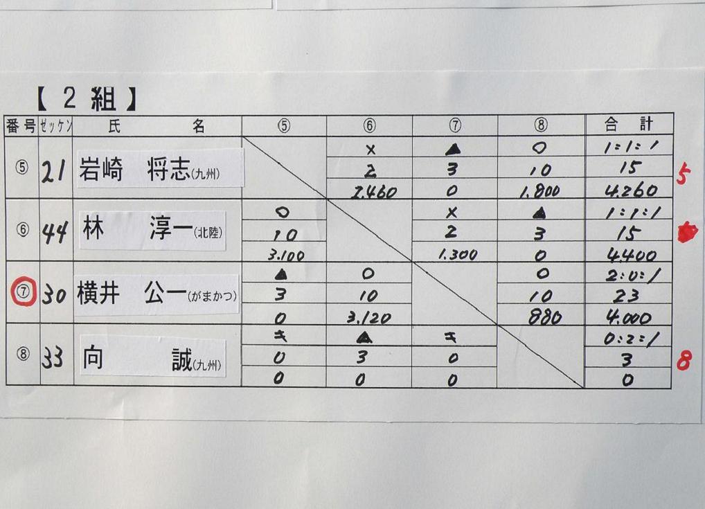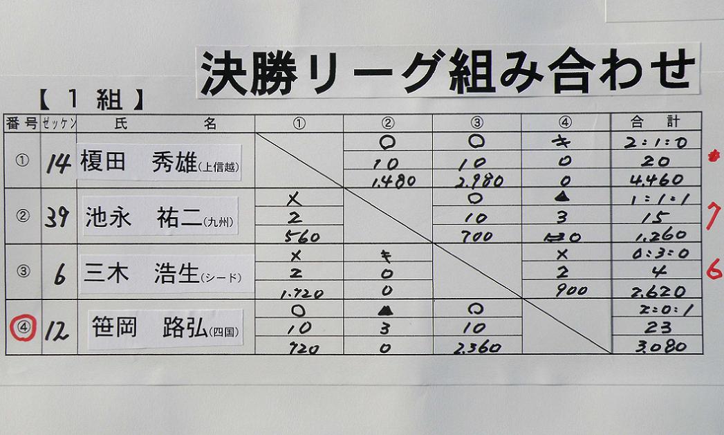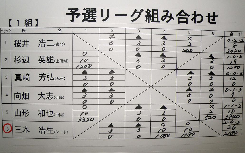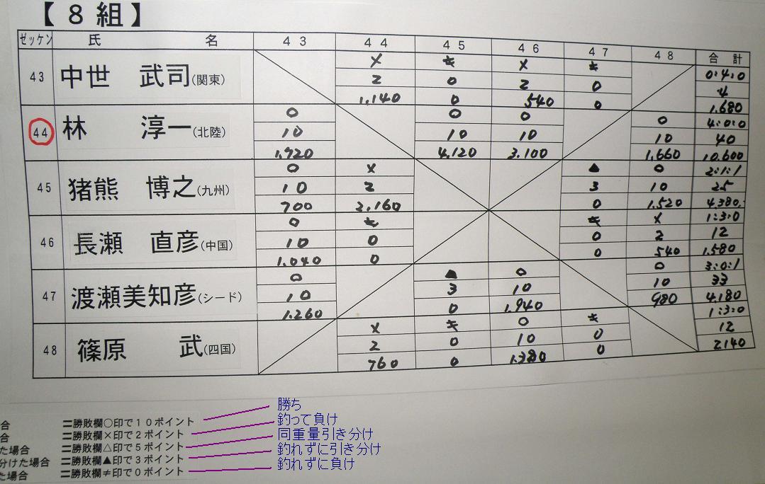 前日の発会式の時に、全員が自己紹介を行なった後、組み合わせ抽選です。48人の選手が6人ずつ8ブロックに分かれてリーグ戦を行ないます。総当りだと5試合になりますが、渡船システムの時間の関係上、4試合だけの変則リーグ戦は致し方ないでしょう。