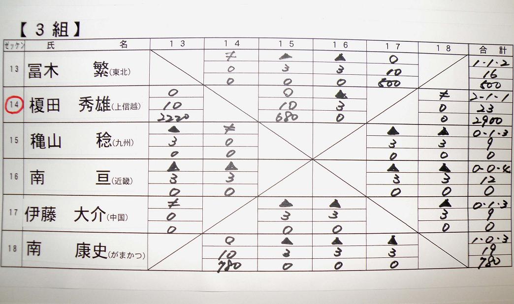 笹岡さん優勝おめでとうございます。全参加者の悔しさと引き換えに、優勝を喜んで下さい。準優勝の横井さんの悔しさは、大会参加者中で一番でしょう。でも、おめでとうございます。榎田さん対戦ありがとう。そして3位おめでとうございます。