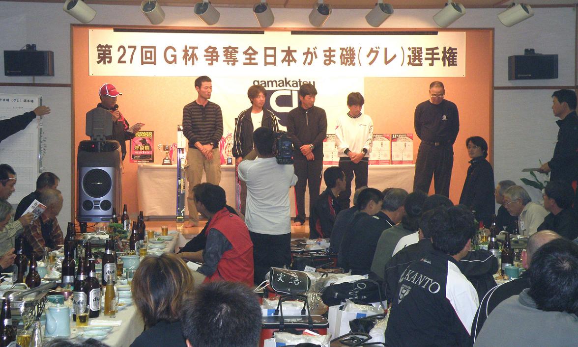 今回の参加総数は160数名だと聞きましたが、閉会式の人数はいつもの様に少なくなっています。優勝は確か19歳?の薮田君で東九州支部に所属しています。彼も中学生の頃から知っている釣人で、大分ケーブルテレビの私のコーナーに、お便りを寄せてくれています。・・・表彰台の高い所で嬉しそうに笑っていました。