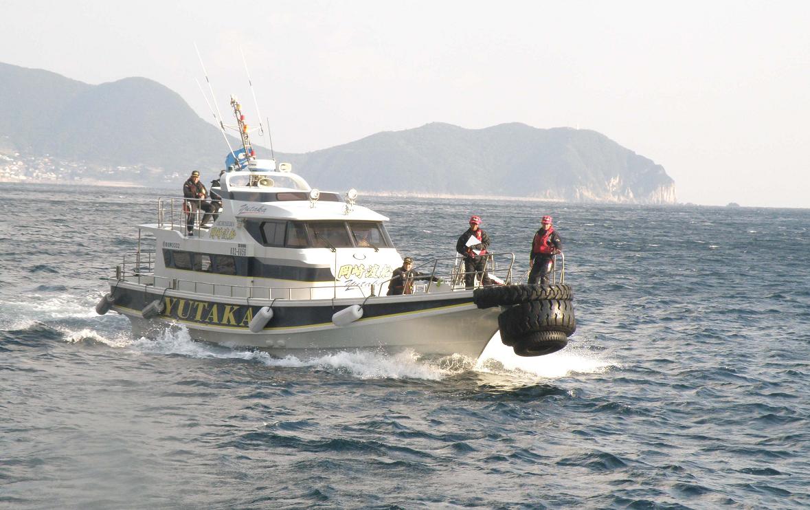 釣りを終えて後方に相島。現地で動く時に使う潮騒丸は中型の船です