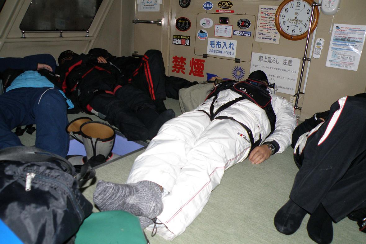 帰港後は本来なら渡船の民宿に泊まるのですが、今回は部屋が空いていないため、潮騒のワゴン車と吉本会長の四駆を借りて、下山君の先導で有川の侑洪園(0959-42-0012)にみんなで移動します。