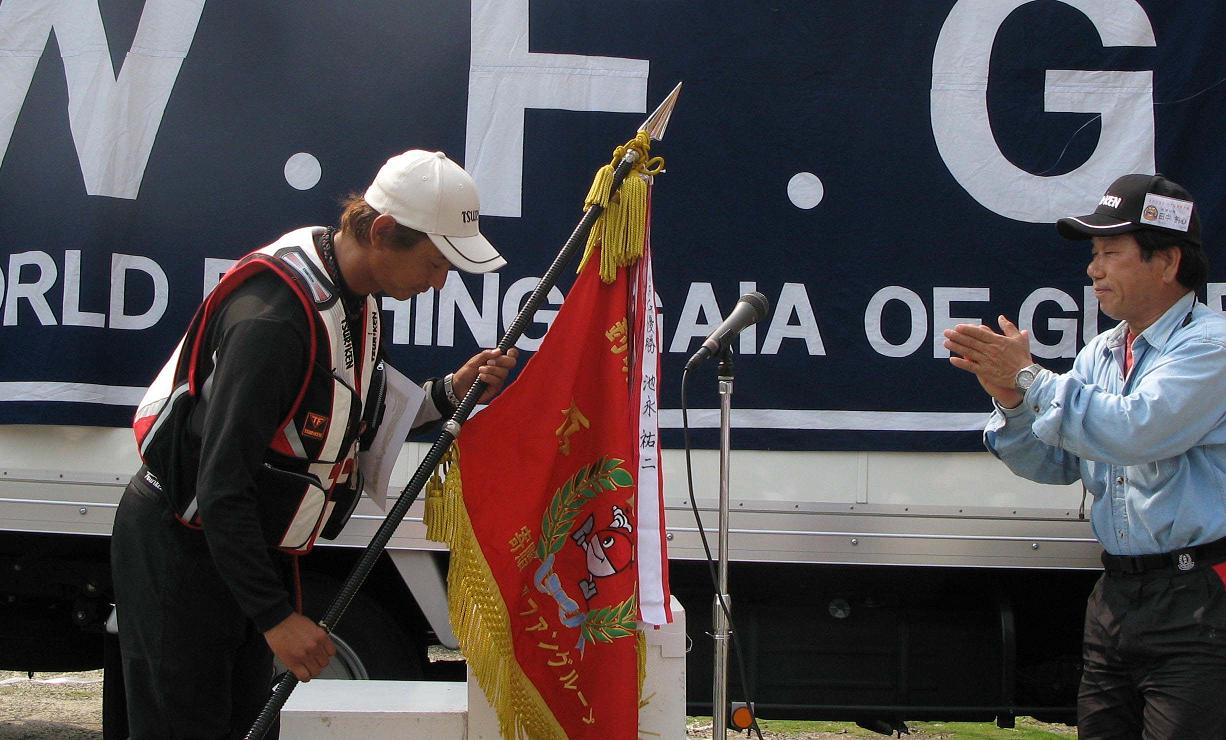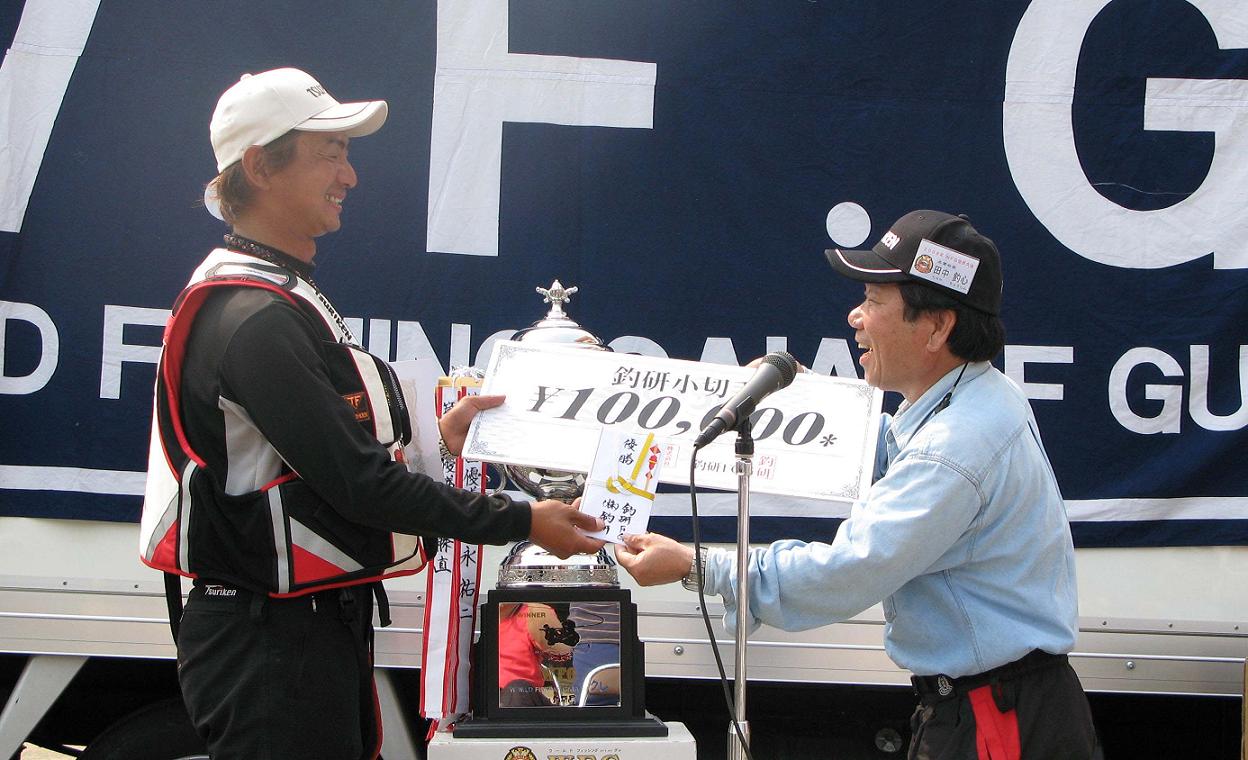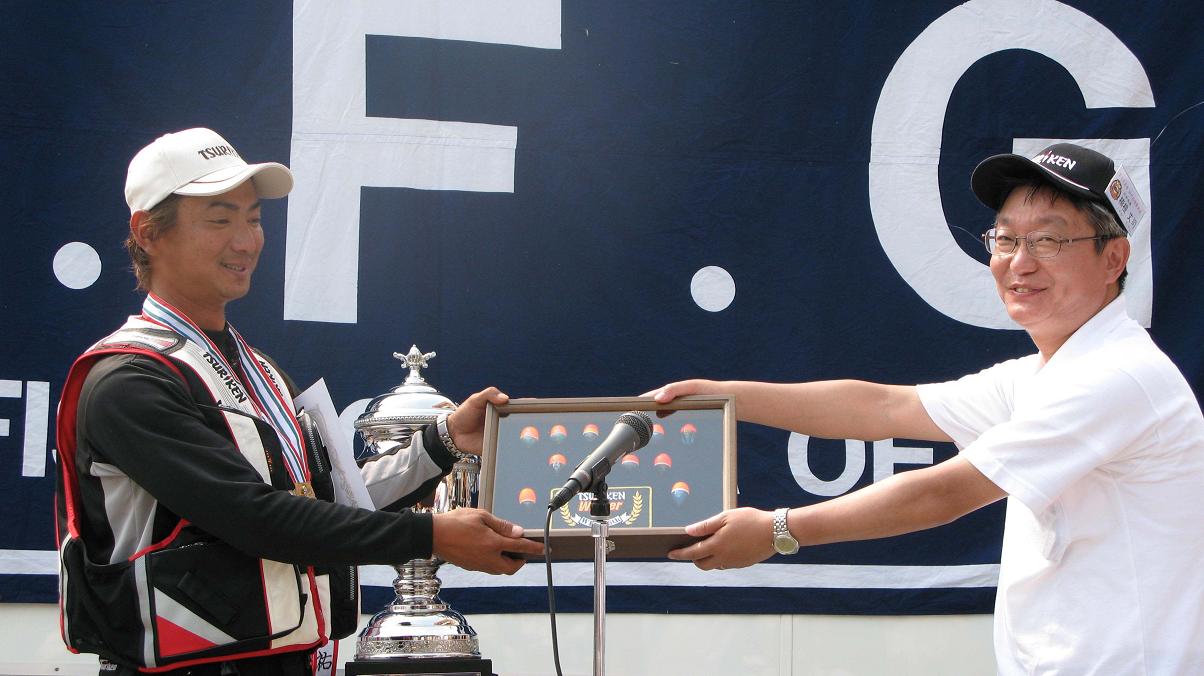 現、釣研社長の楠根大会会長。オリジナルフィッシングスーツの授与