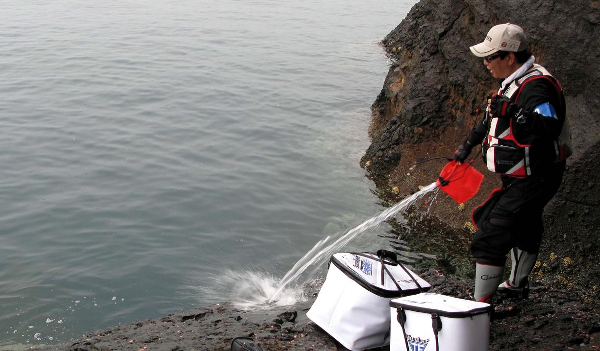 釣れたグレはライブクールに入れて、検量後はリリースです