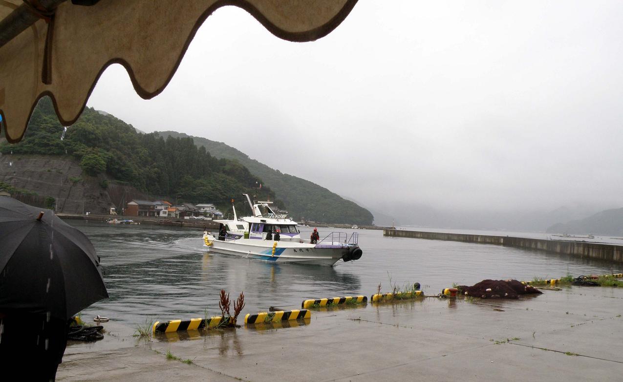 一回戦を終え、雨にも負けた選手が小浦港へ帰って来ます