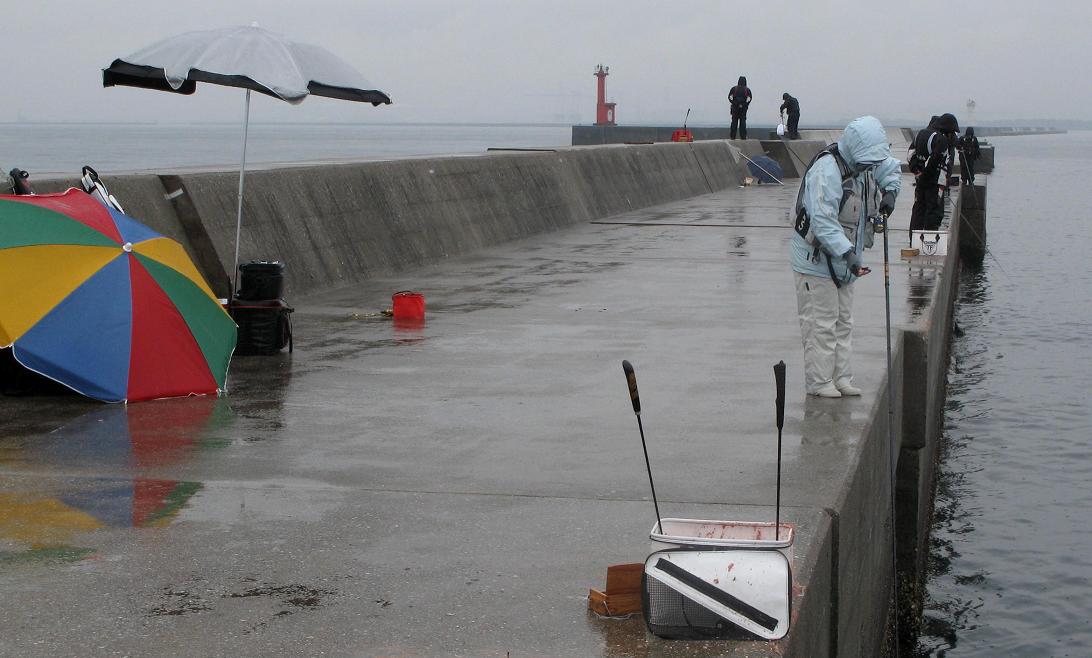 ここは大型カンダイの目撃情報がある防波堤で、期待が持てます。足元の水深は5m弱?捨石などが見えるので、マキエを打ち続けながら様子をうかがいます。
