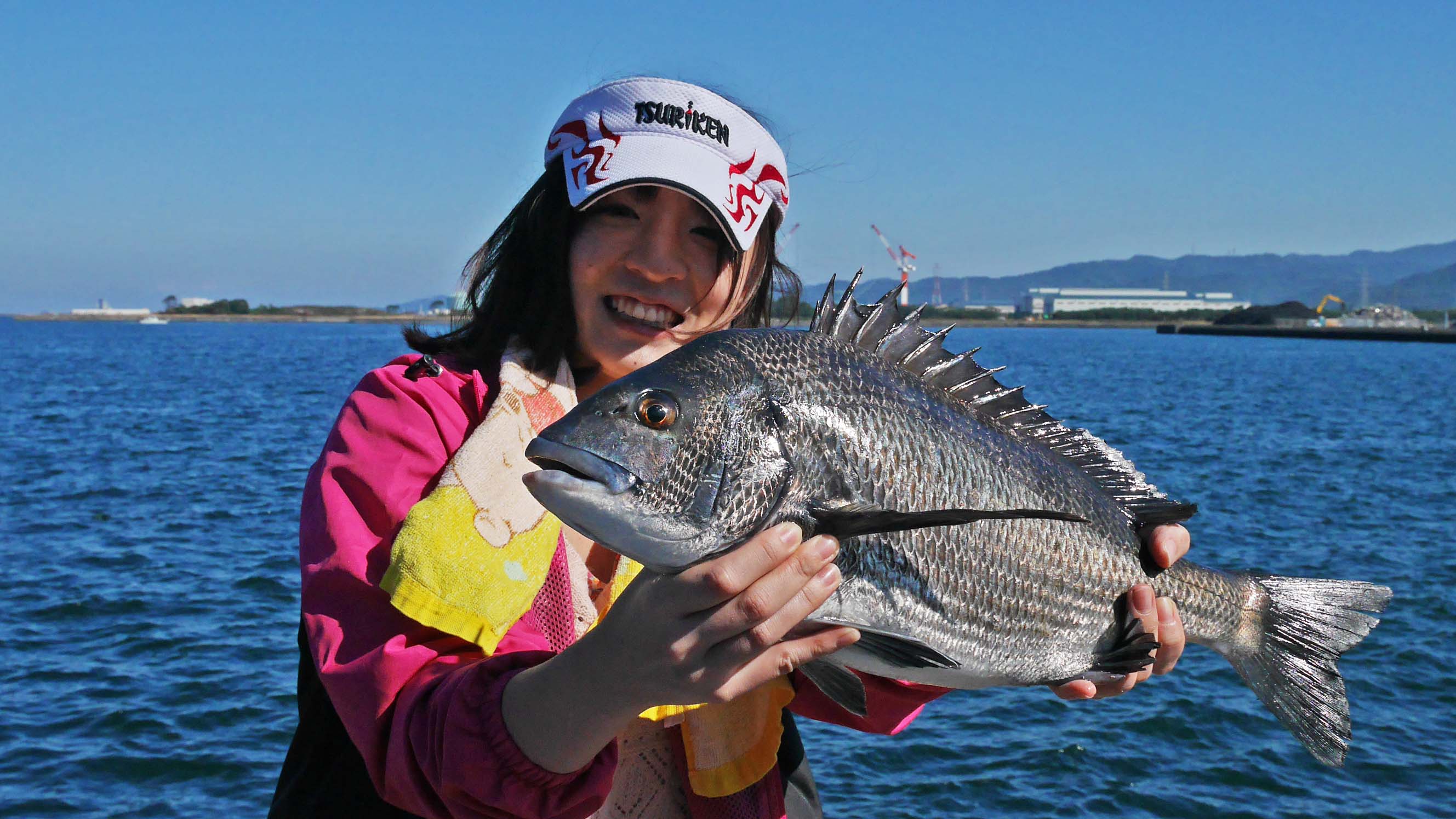 重くて強烈な走りが手元に伝わってきます。その竿を由香里ちゃんにバトンタッチです。ワーワー騒ぎながら巻いたり糸を引き出されたり数分の格闘です。初めての釣りで第一号がいきなり50㎝‼?大きなチヌが海面を割って姿を現したのです。