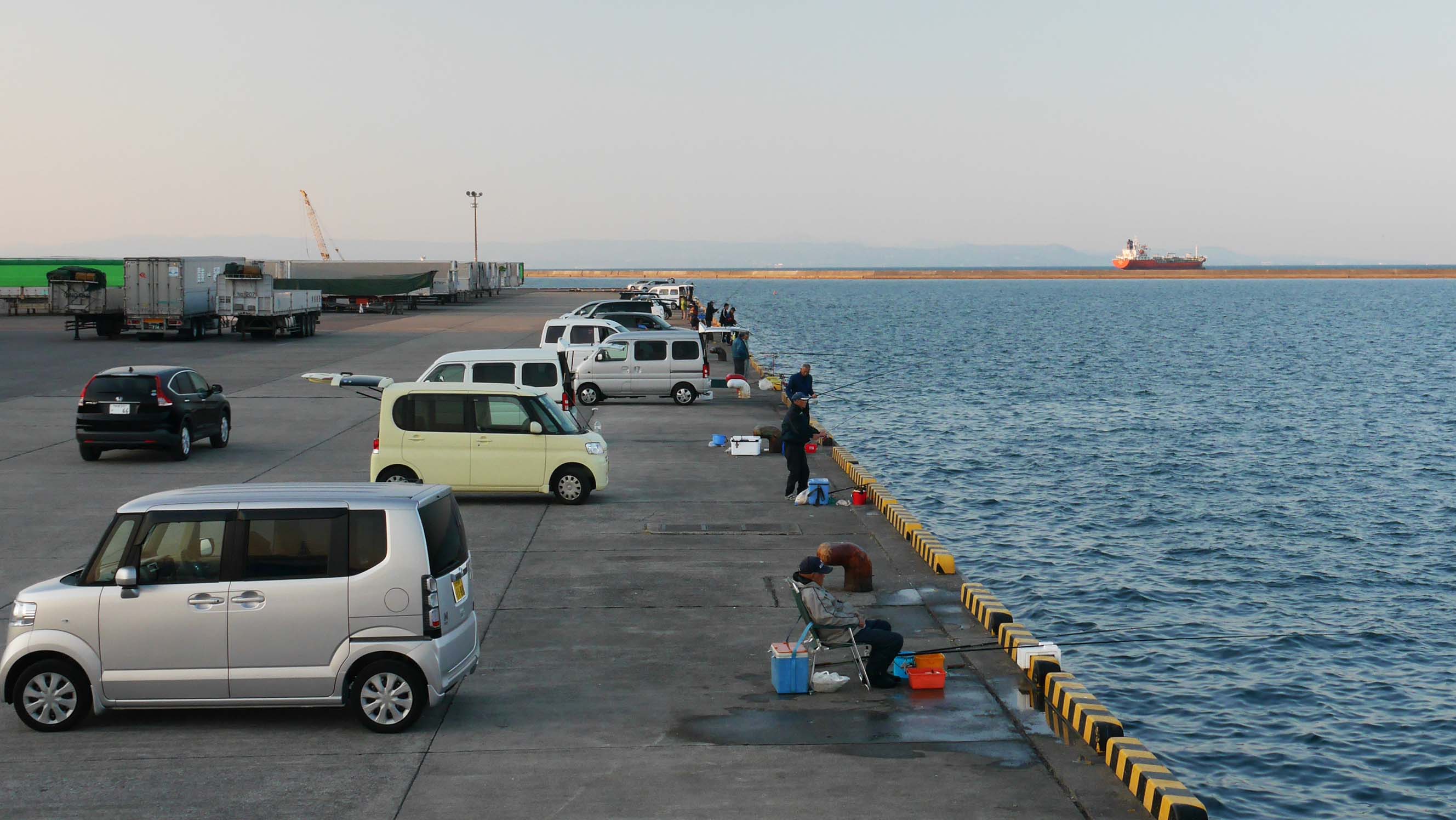 いよいよ大在公共埠頭へ移動です。途中トイレ休憩をしてから釣り場に到着したのですが、チヌの良く釣れるポイント周辺には一人の釣り人も居ません、釣れていないのでしょうか?釣る前に薮ちゃん差し入れのアイスを食べてマキエを撒きはじめました。