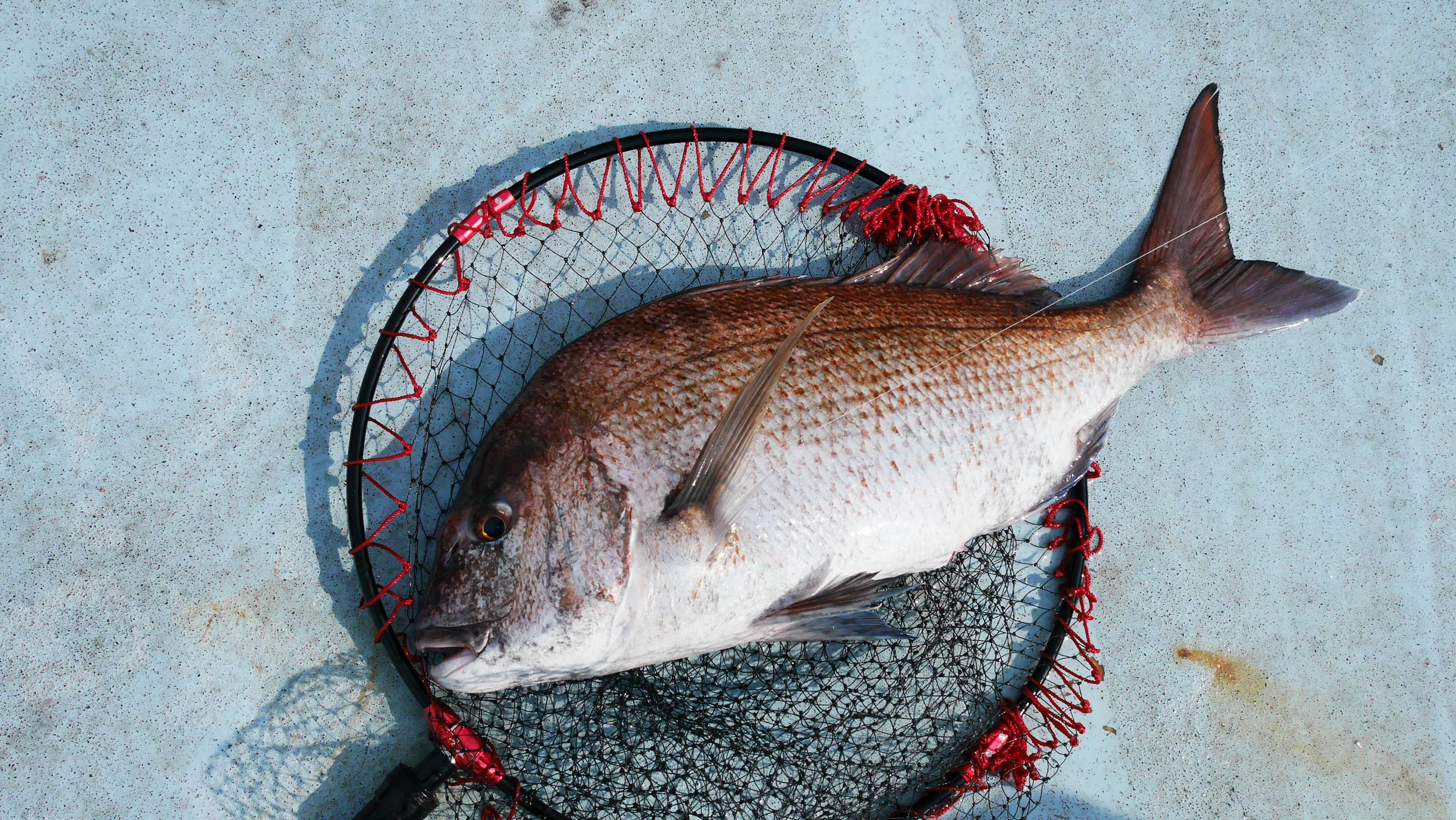 朝までゆっくりと仮眠し、偶然一緒になった一人のクラブ員と共に養殖イケスのカセ釣り・筏釣りでのマダイ狙いに挑戦です。ここの水深は23mほどありますが、潮はゆっくりと流れるので、1000釣法などで上からゆっくりと探る釣りに分があります。