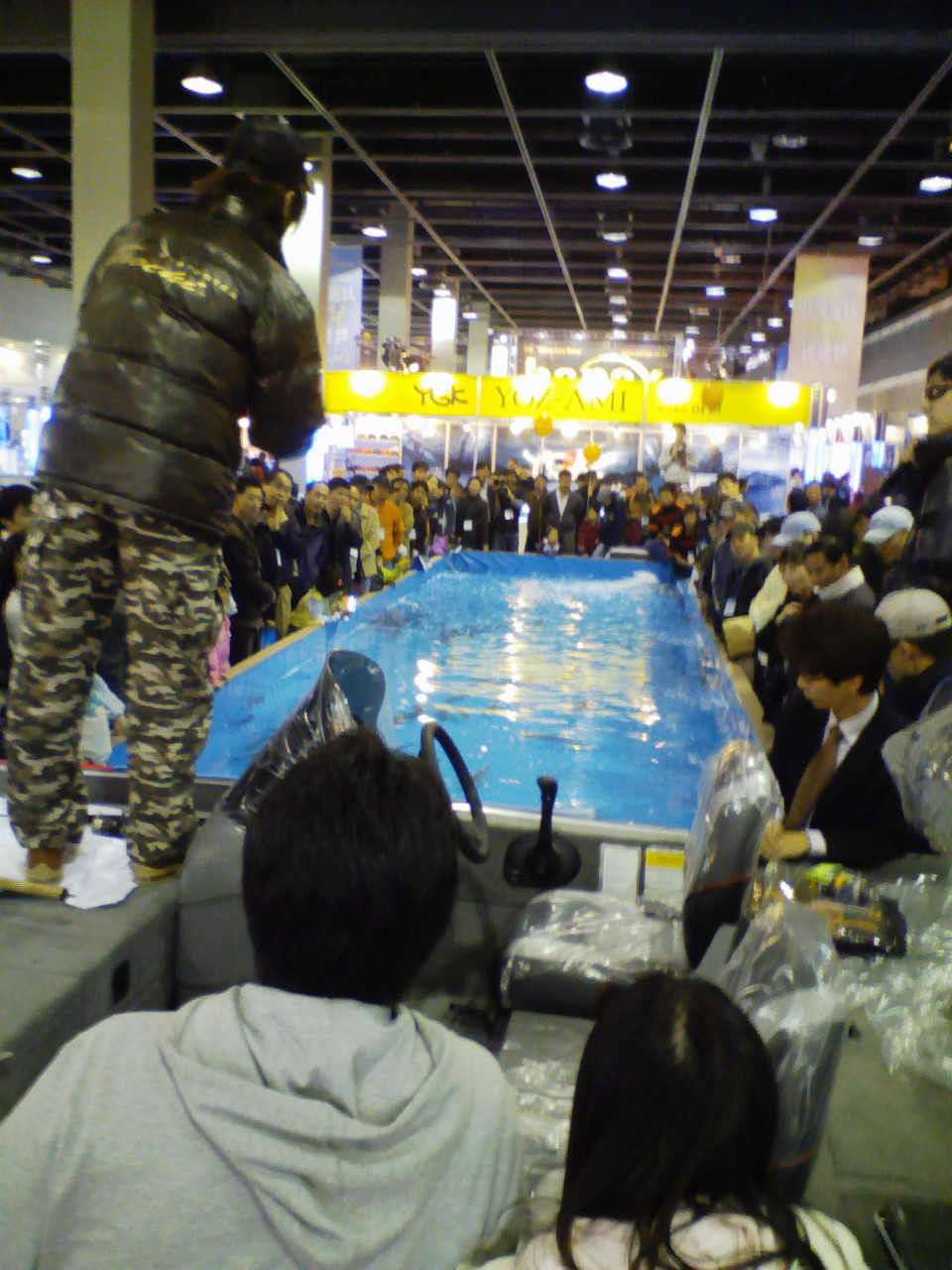 今日も無事に一日を終了しました。日本の出店企業としては、釣研・がまかつ・ダイワ・シマノ・シーガー・サンライン・キザクラ・ハヤブサ・メガバスなどなど…。今日の講演内容は、竿の構え方・道糸の繰り出し方・オーブンベイルでのアワセ方・1000釣法仕掛けの作り方・やり取りでのリールの巻き方…なでを実際に竿を使って行いました。皆さんは真剣な表情で聞いてくれます。今日も一日、とても有意義な日になりました。でも、やっぱり立ち仕事はきついのです。今日はこの辺で就寝する事にします。おやすみなさい。