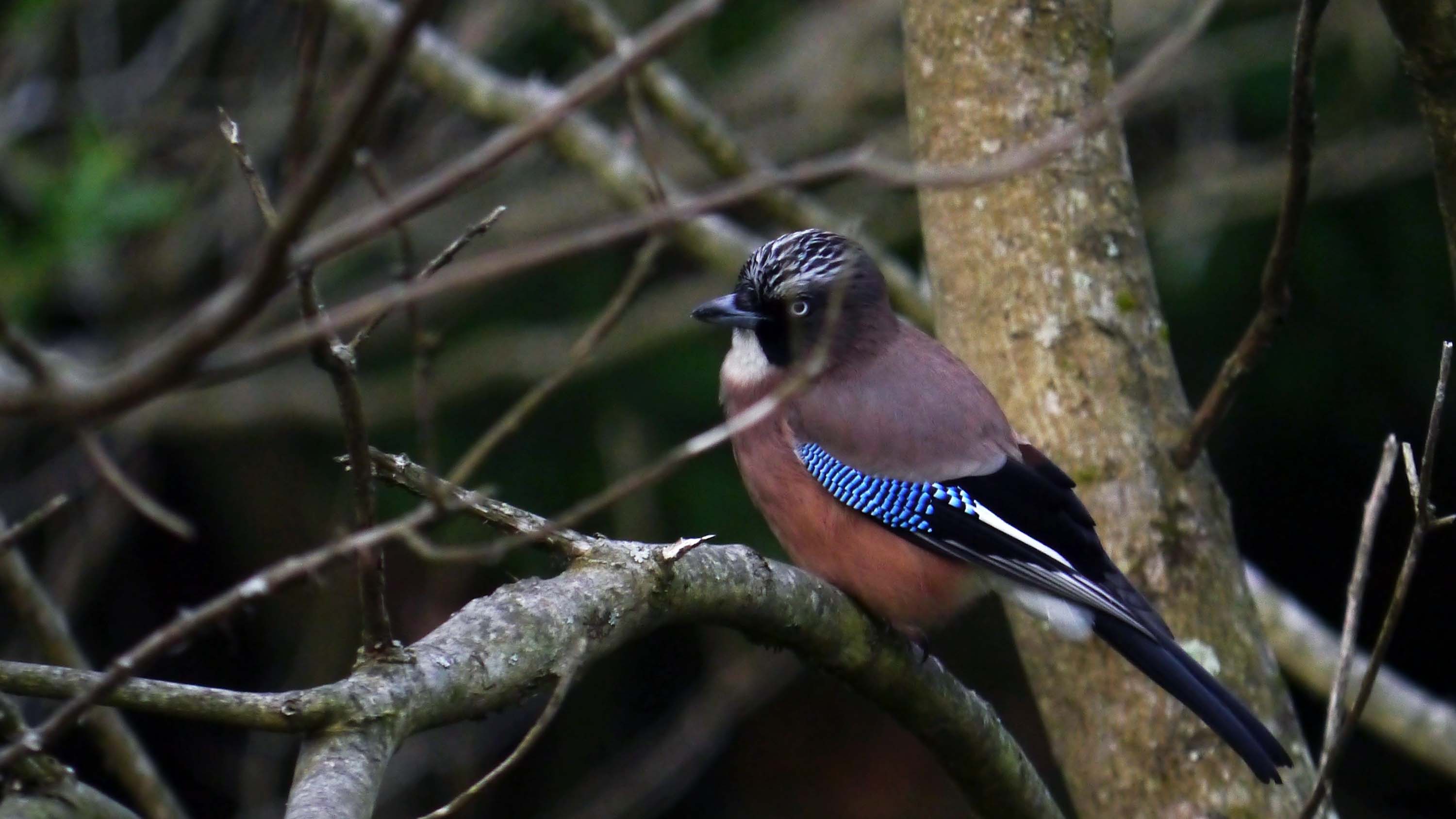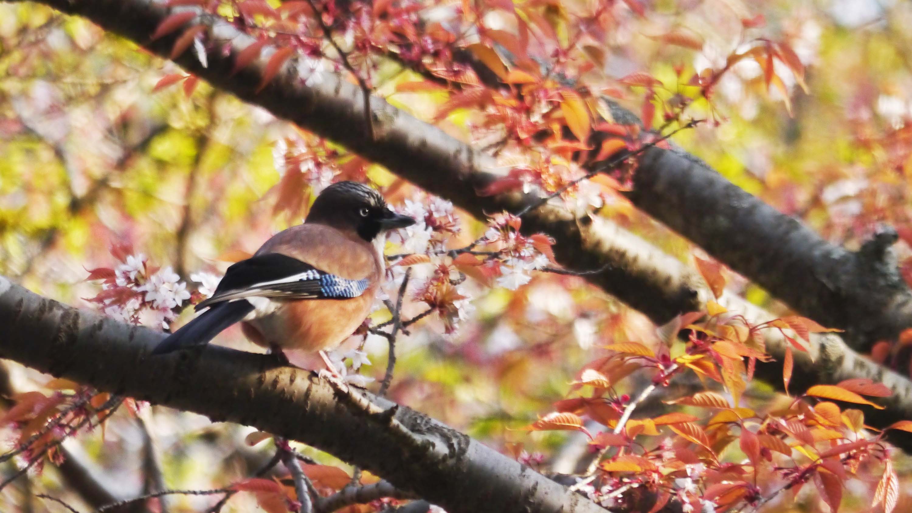 県民の森にある青少年の池で、桜の木々を盛んに動き回るカケスが2羽。