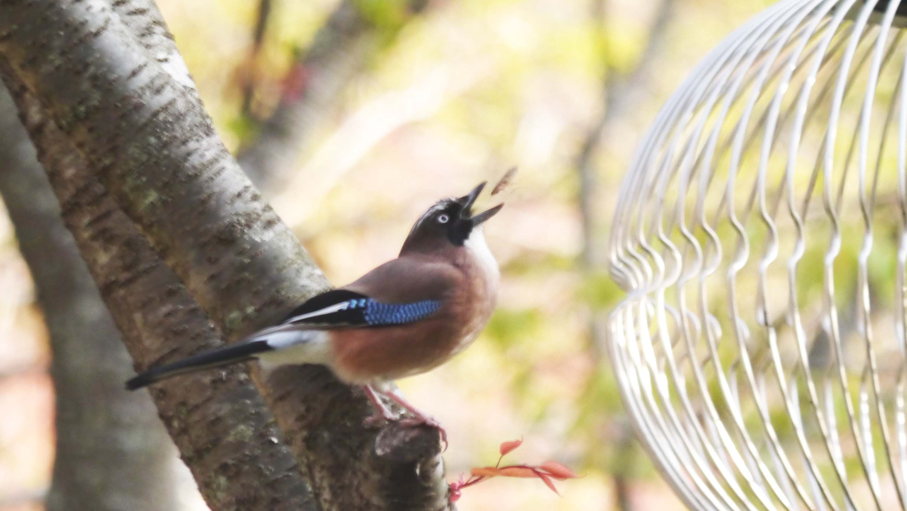 その奥のドックラン付近では、ウソと一緒に動き回るカケス。