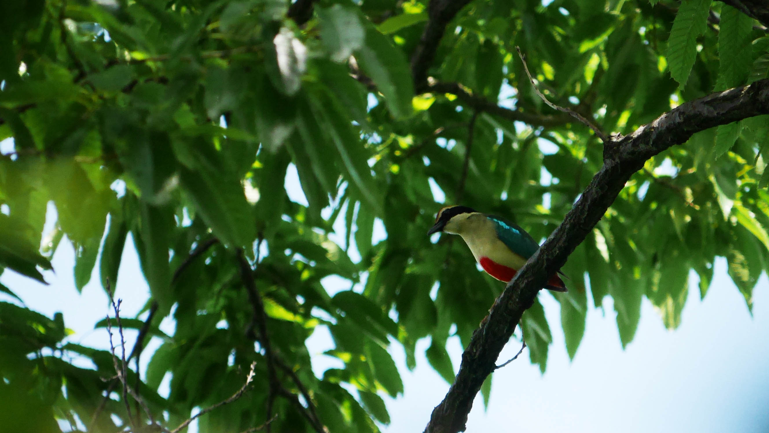 いつもの場所からアカショウビンの鳴き声が聞こえた後、昨日ヤイロチョウが鳴いた付近から今日も鳴き声が聞こえてきます。すると近くの尾根付近から、少し高い音色のヤイロチョウの声。二つの鳴き声はお互いに鳴き合いながら、低い声のオスと思われる個体が高い音色のヤイロチョウの場所へと移動して、同じ場所で暫く鳴き合いました。