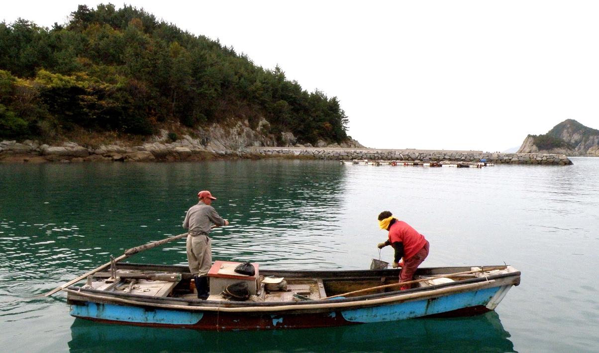 老夫婦が伝馬船でカニ籠をあげにやってきました。結構捕れています