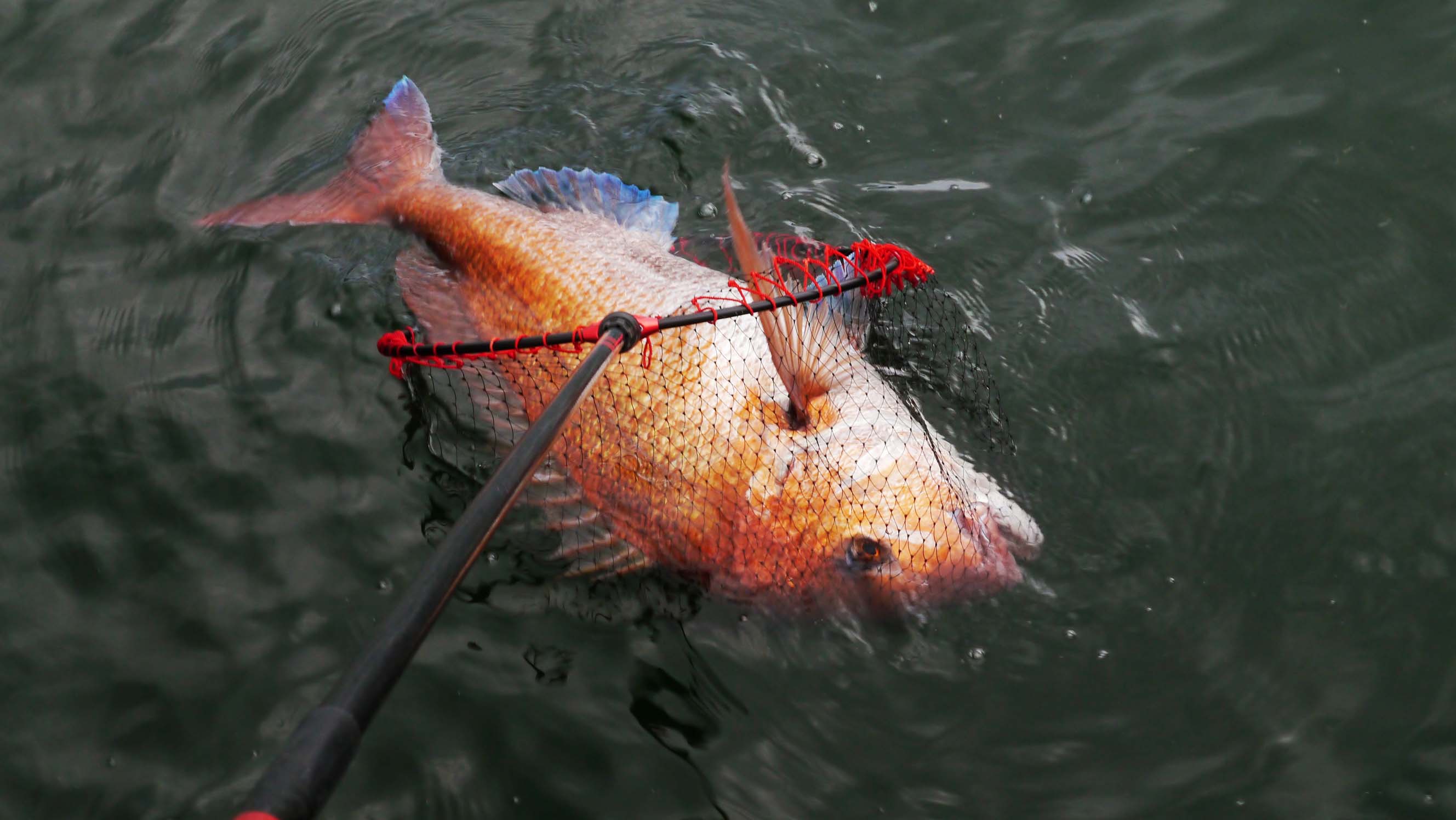 このタモ枠の直径は40㎝です。網は口径40㎝・深さ50㎝の大きさです。グレ・チヌ用に使っており、掬っている魚は85㎝・7.56㎏のマダイです。
