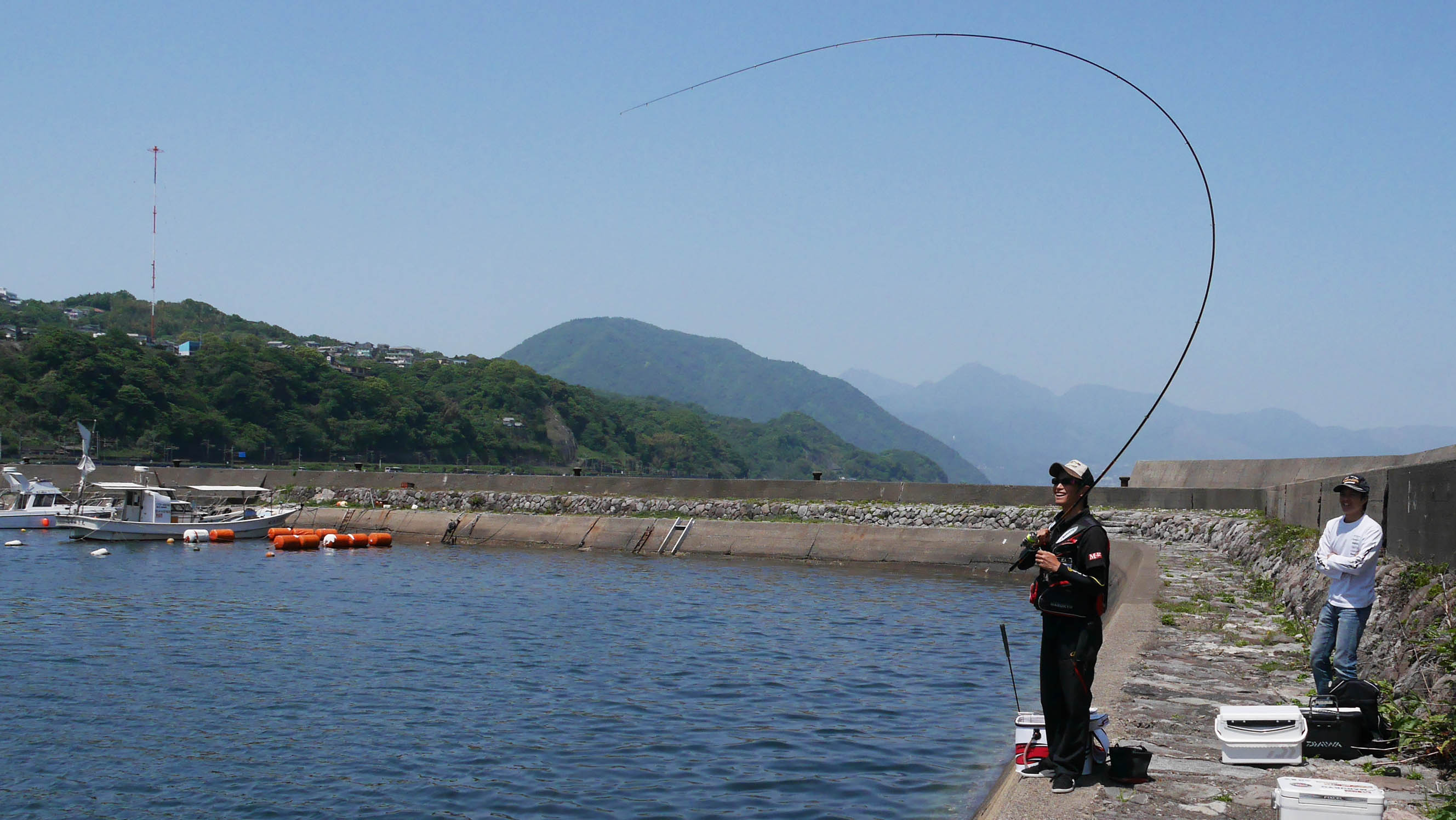 チヌ竿を曲げる時の一つに投入操作がありますが、これは竿の胴にウキの重さを載せて振り込む事が大事。もう一つの竿曲げは、魚の引きに対してですが、これも竿の胴で受け止める竿捌きが重要なのです。