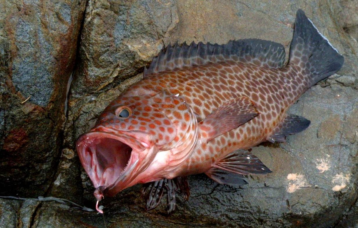 場所は島の浦の二のハエで、移動ウキ仕掛けで底の方をキビナゴで狙っていたら、飛びついてきました。ホウセキハタに似ていますが、斑点が大きく、尻尾の後縁が白い事でオオモンハタです。