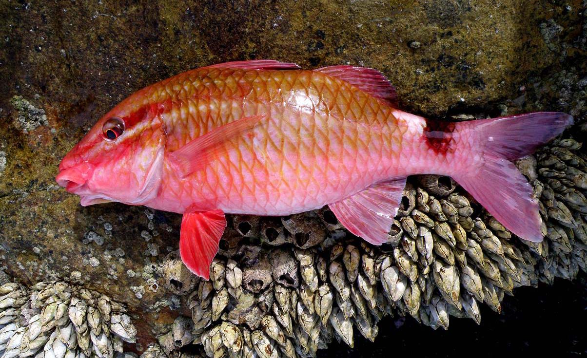 アカハタだと期待したのは一瞬の喜びで、がっかりして絵を撮って逃がしてあげました。似た魚にオキナヒメジが有りますが、黒点は側線を越えません。オジサンは黒点が二つ、ウミヒゴイには黒点が有りません。