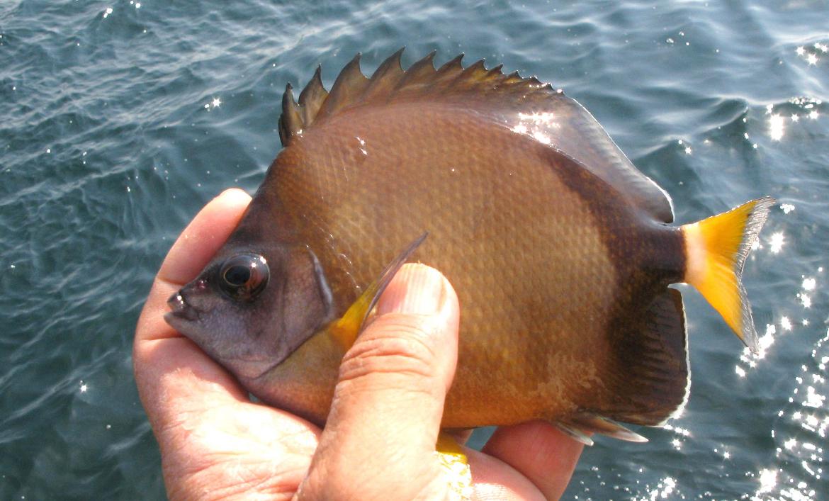 このお魚さんも、カゴカキダイやチョウチョウウオなどと混じって、磯際にたくさん群れていました。触るとヌルヌルしていますが、とても可愛いです。エサ取り魚には入らないでしょう。