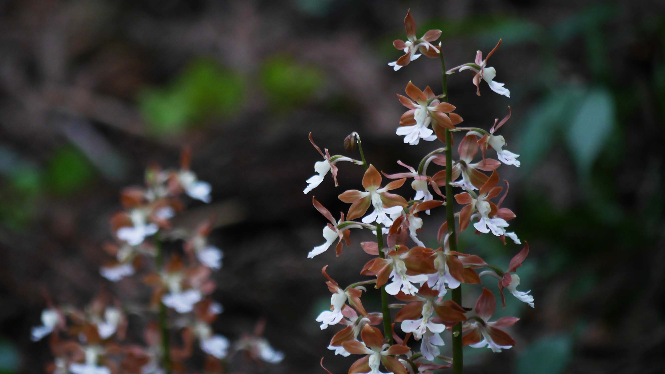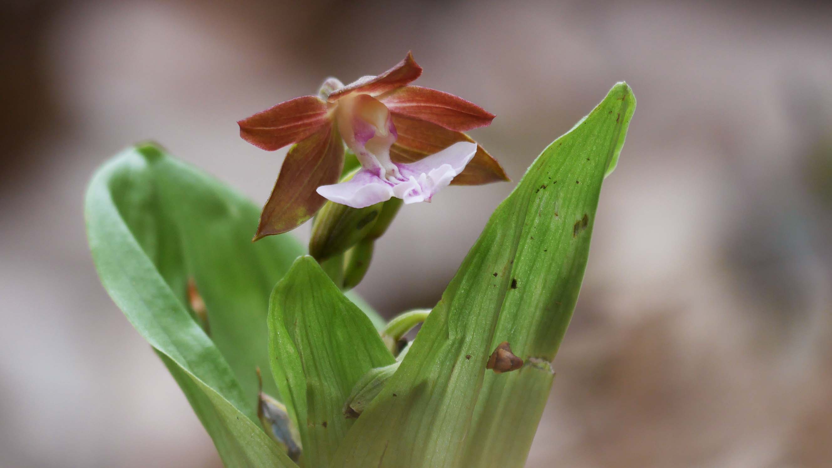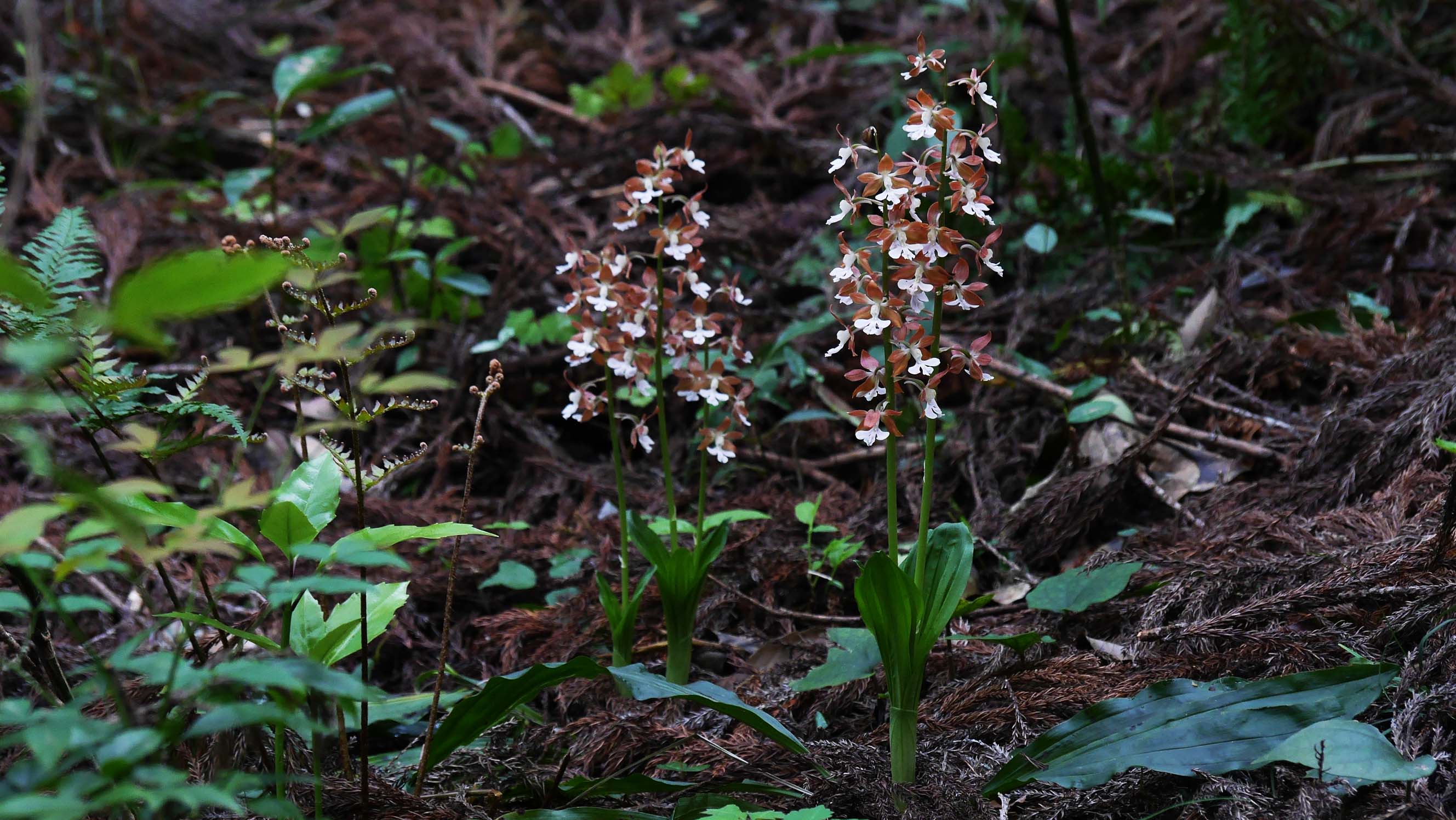 杉の林間に咲いているエビネ。