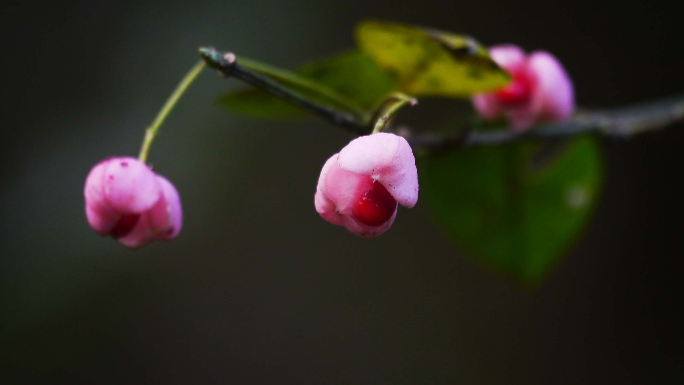 淡いピンクの花弁が開き、中から綺麗な赤い実が覗いていました。