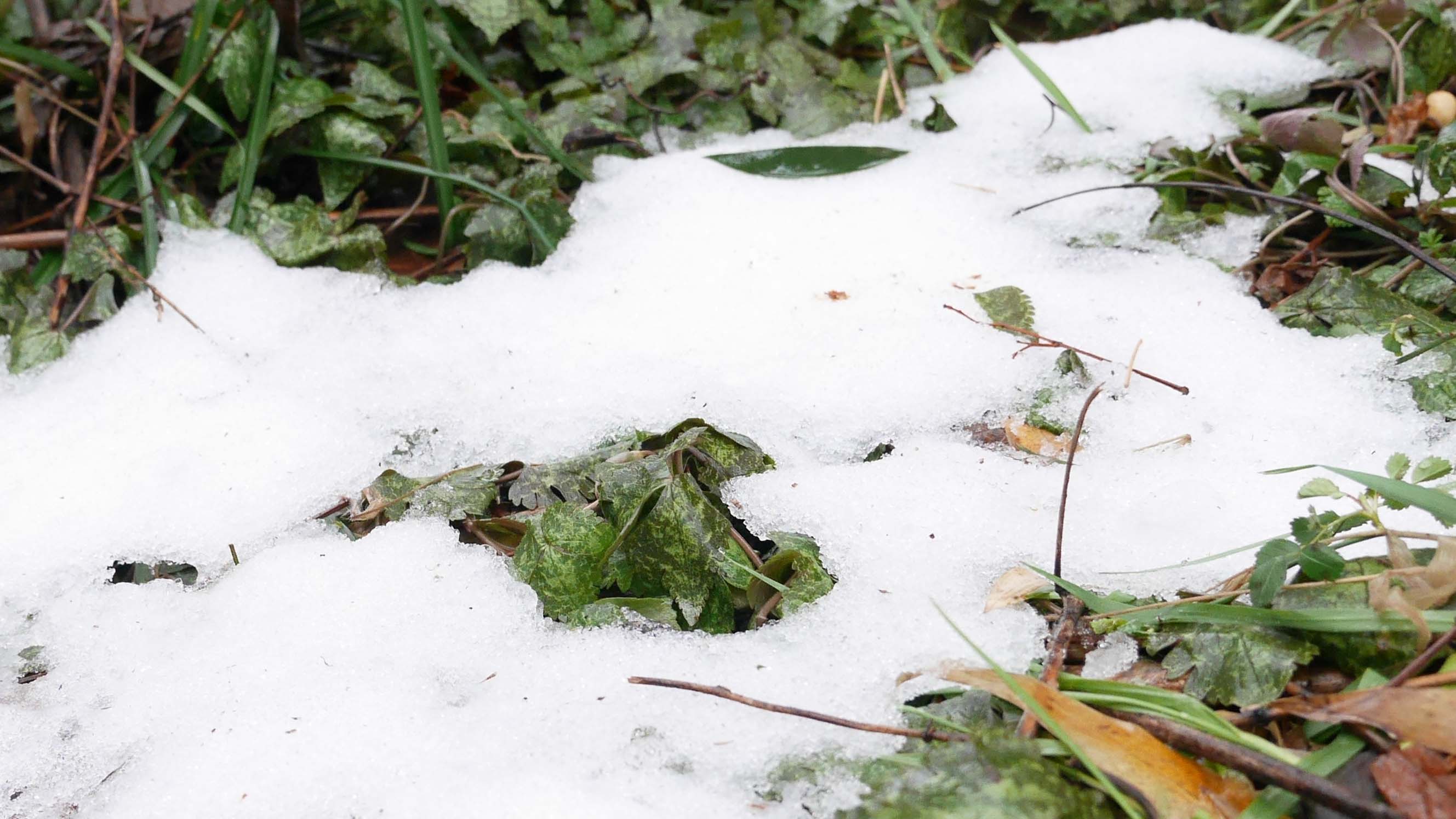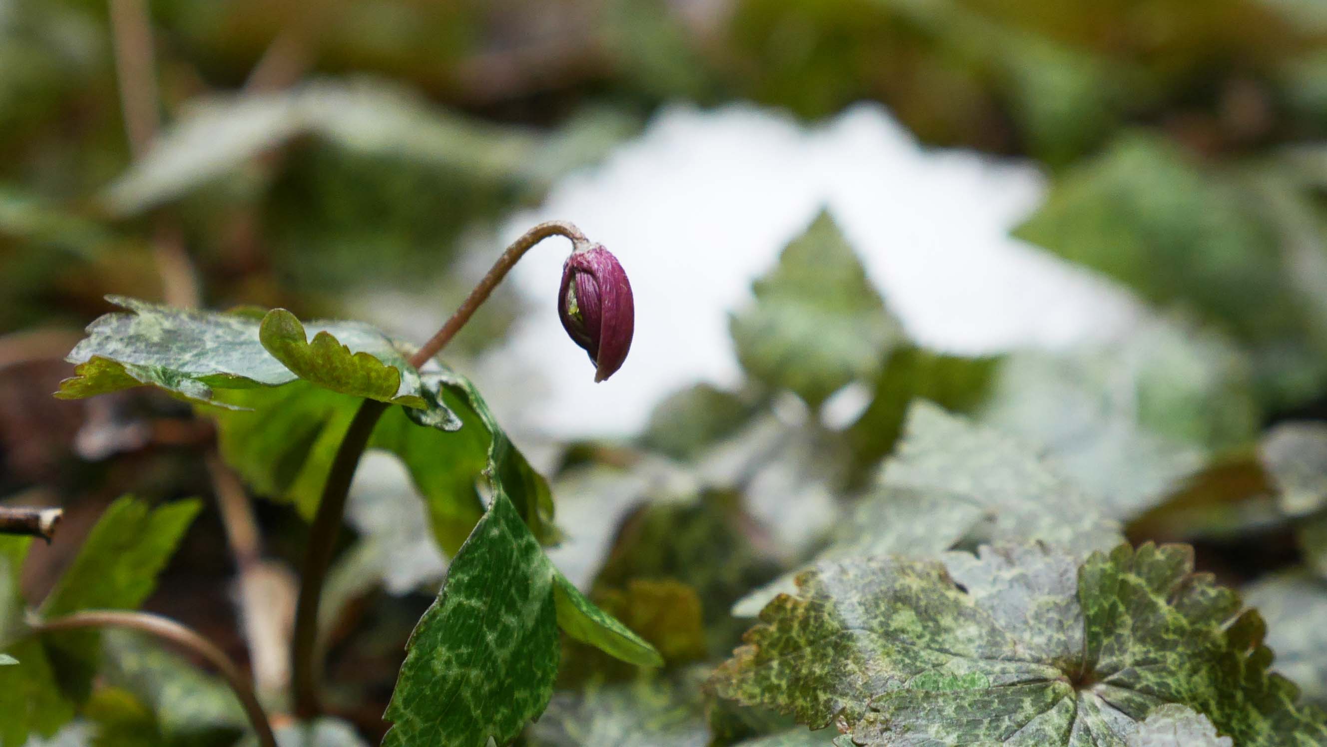 積もって解け始めた雪の間から、ユキワリイチゲの葉っぱ