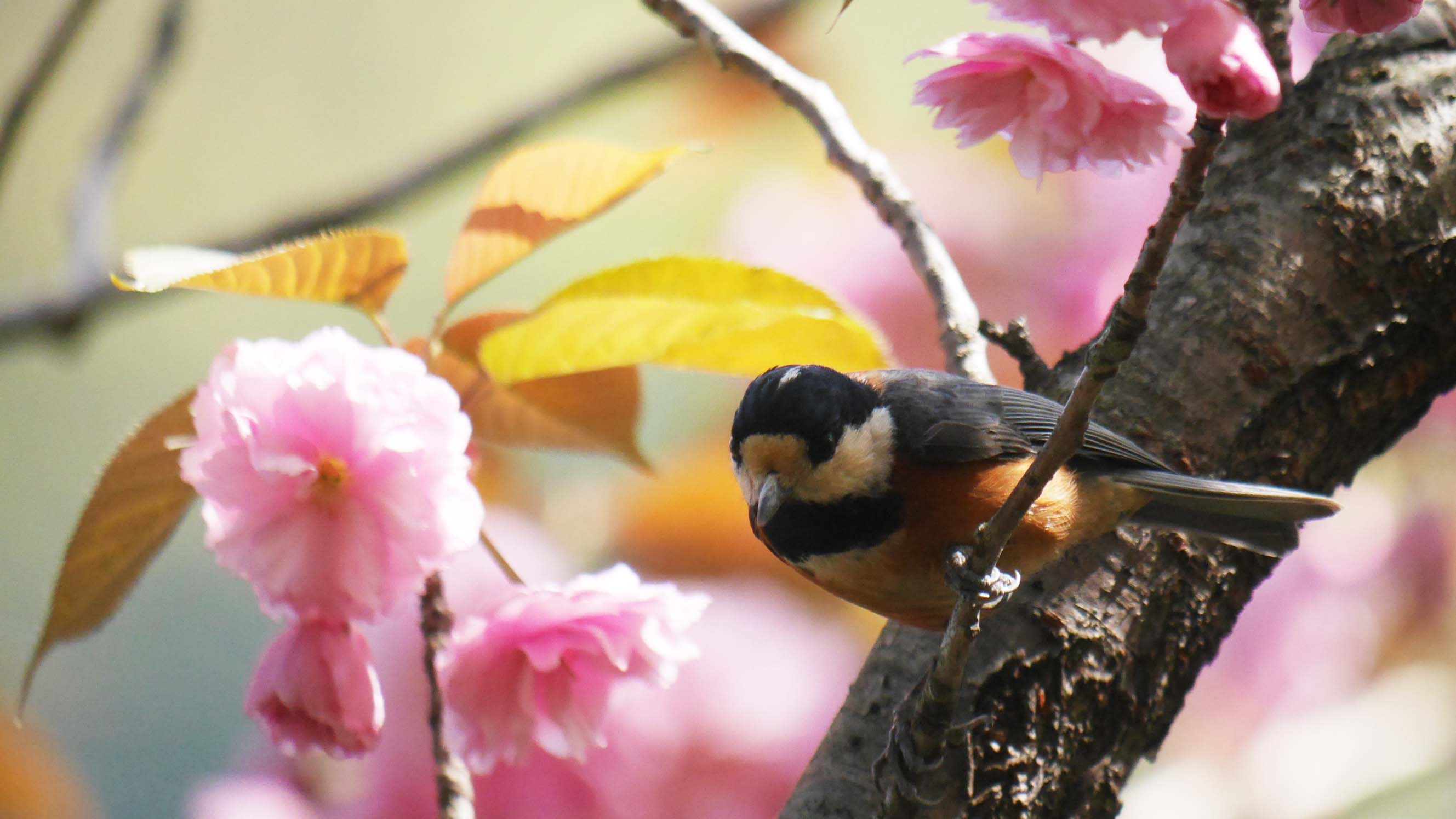 八重桜とヤマガラ・・・どちらが主役か分りません。
