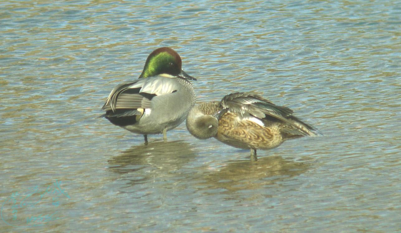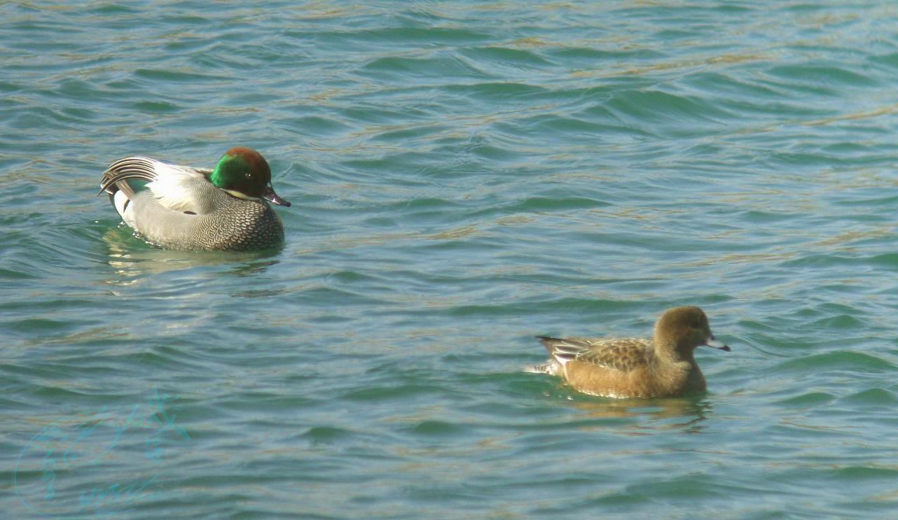 ヒドリガモやカルガモ・コガモなどはたくさん居ますが、その群れに混じってかなり綺麗な水鳥が、逆立ちをしたり潜ったりしながら一緒に食事をしていました。
