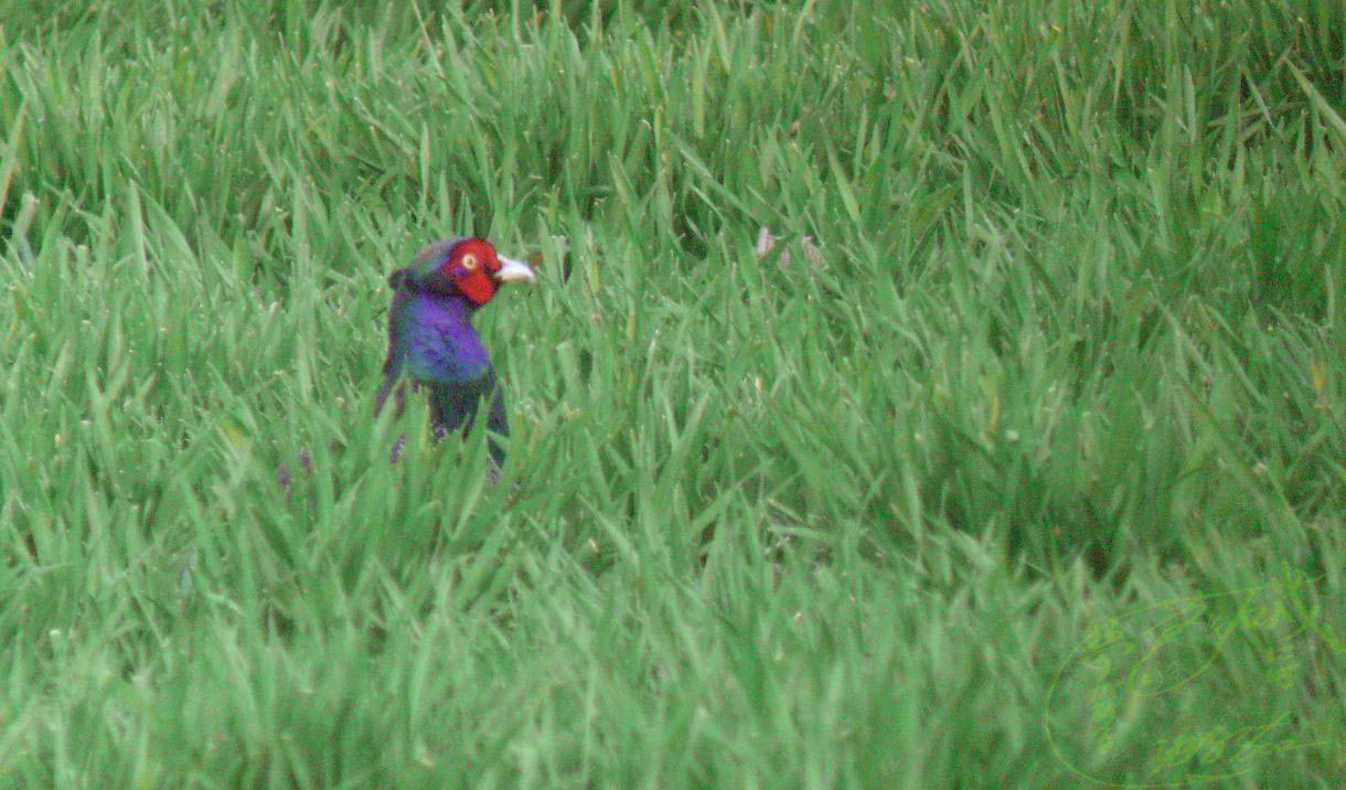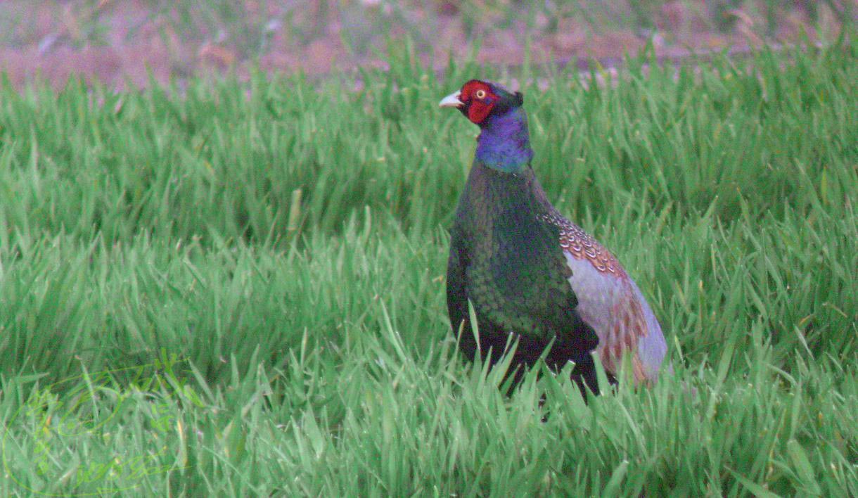 朝6時20分には現地に着いて、車の中で待機していました。民家・畑・荒地・小さな林・土手・大分川などの条件で、いかにもキジが出そうな所です。朝一番ならキジに出会えるかも・・・淡い期待を抱いて牧草地をしばらく見ていると、黒っぽいのが動いています。フィールドスコープで確認したら案の定キジでした。
