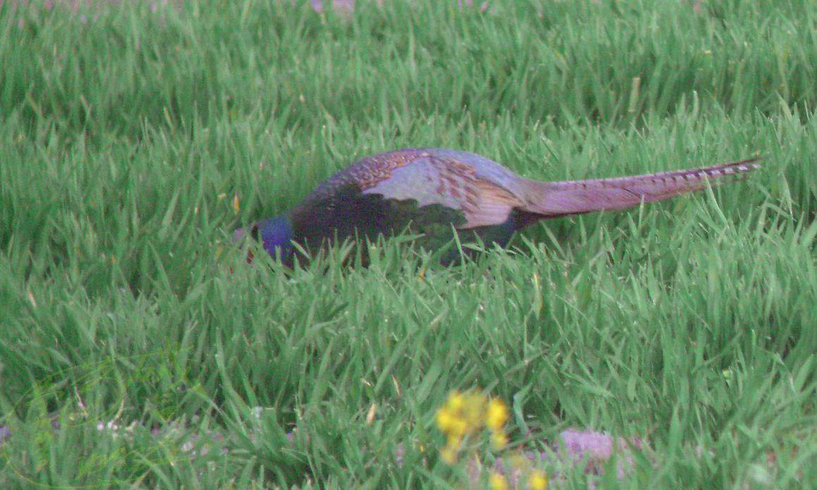 シャッターを切り続けていたら見えなくなりました。人が近づいたので隠れている様です。散歩の人は5~10mくらい傍を通過して行きます。人が通過した後、キジは自らの安全を確認してから、再びエサをあさり始めました。
