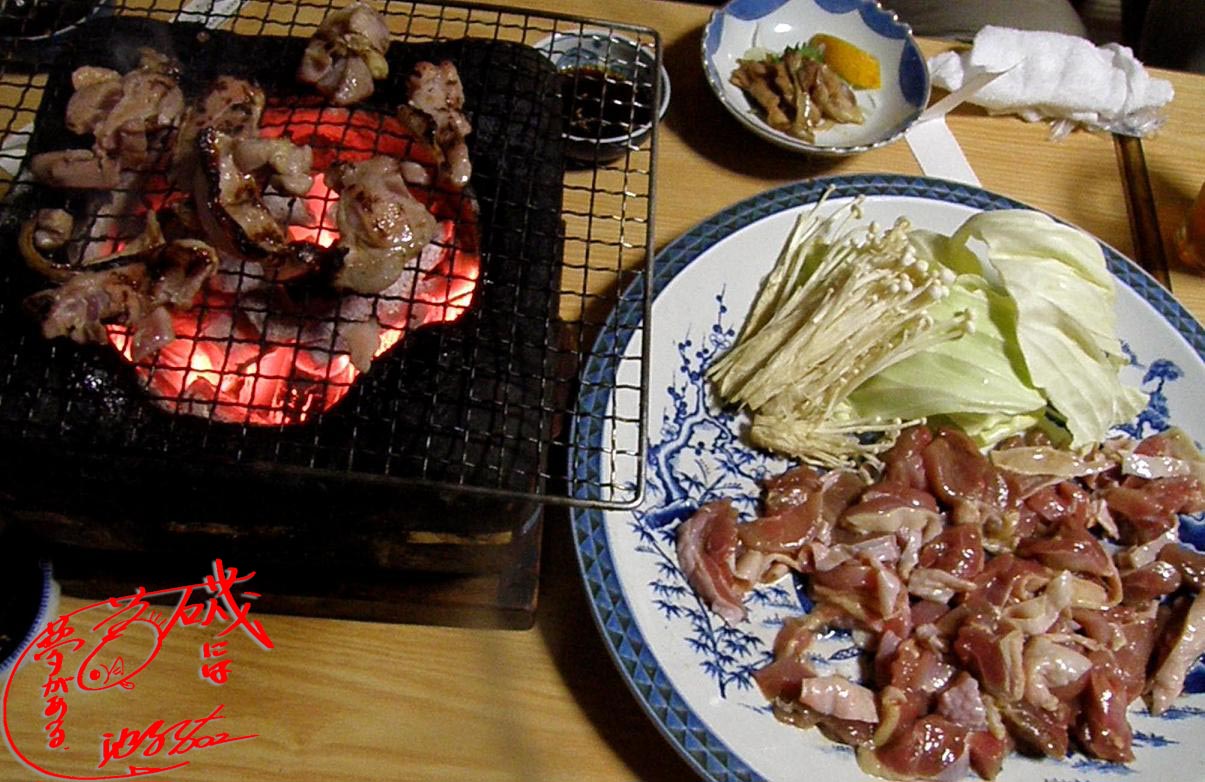 炭火で焼く地鶏は本当に美味しいですよね。他に軟骨の唐揚げ・砂肝の唐揚げ・イノシシの肉などと、麦飯のおこわにはセリも入っていて食べまくりました。