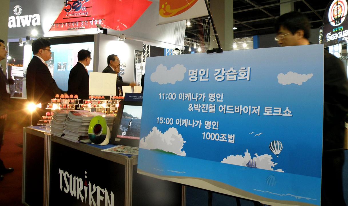 今回は釣研ブースでの仕事です。3日間を通して午前中は韓国の名人・朴(パク)さんとのトークショー、昼からは1000釣法などの講演会を行ないました。