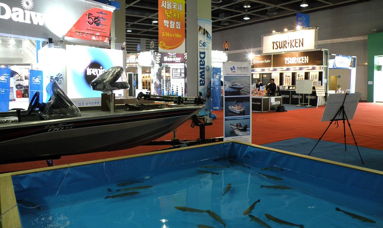 釣研のブースの前にはダイワさん。手前はルアーの池で泳ぐレインボー