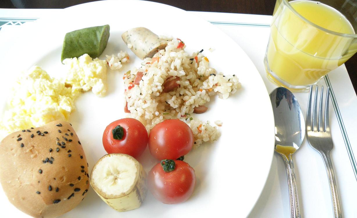 ホテルの朝食バイキング、緑のウインナーは青唐辛子入り