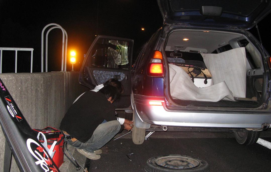 GFG九州主催の釣り大会が長崎の平戸一帯で開催されるので、大分から3人で向います。車に乗せてもらい、大分道から長崎道に入って武雄北方インターを出ようとした時に後輪がバーストです。