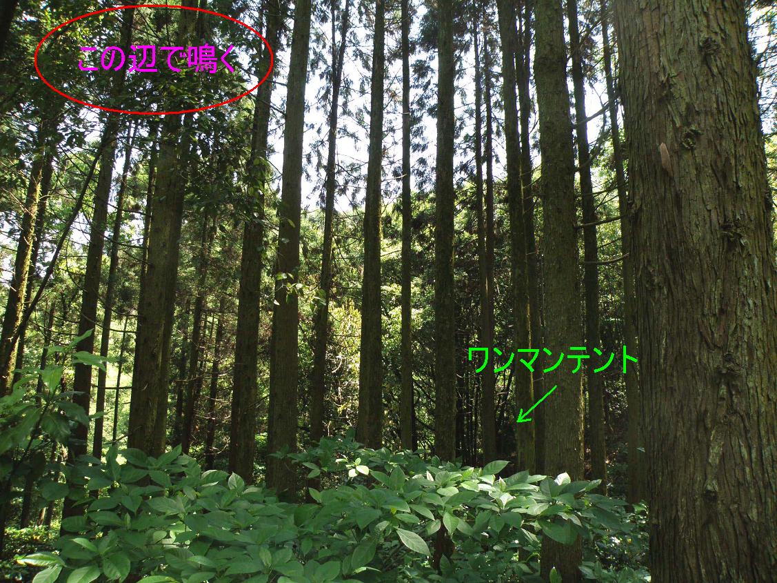 初回はテントの場所から狙って、一度だけカメラの前に現れましたが、あいにく手前の枝に焦点が合ってピンボケ。二度目はこの絵を写している場所から狙って、真上に来られてアウト。3度目は絵の下草の中から狙って遠くのシルエットだけ、今日はテントの場所で狙っていたら、10mくらいの距離に来て、一瞬テントを睨みつけ?その上を通過。