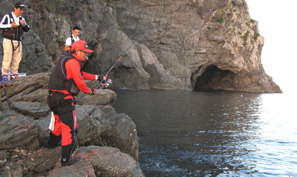 本命のグレ、竿を曲げる高里君は釣りに対する意気込みも本職以上?
