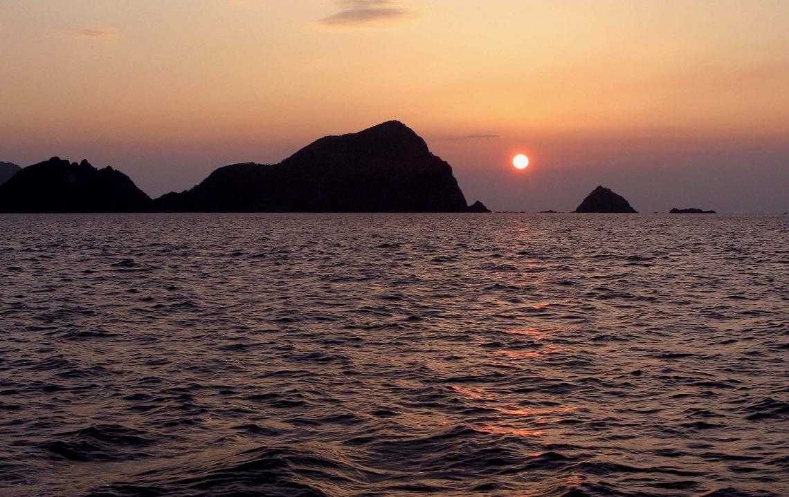 朝6時に若戎丸で米水津湾を出ると、横島から綺麗な朝がやってきました