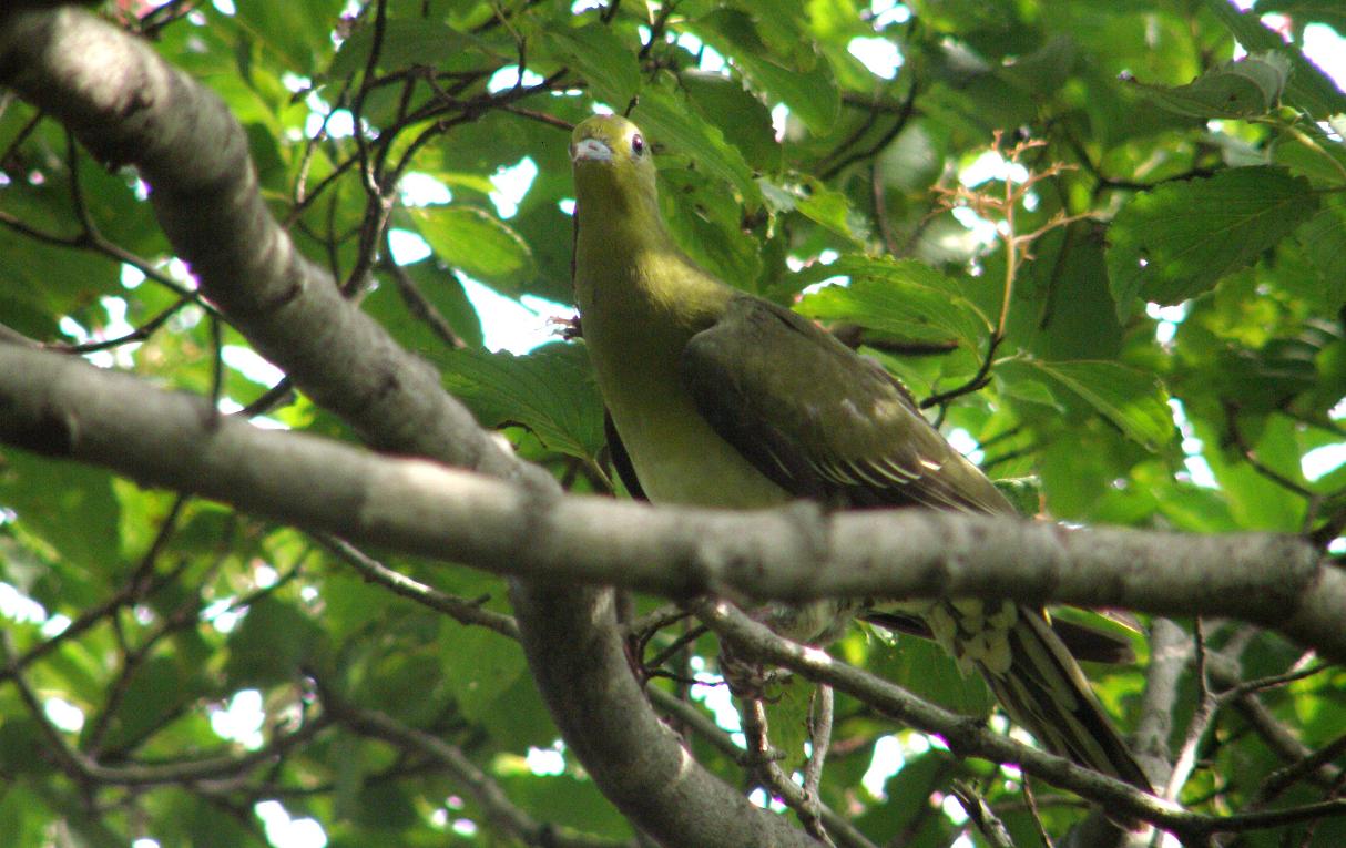 そこへバタバタと羽音を立てながら大き目の鳥がやってきました。良く見るとアオバトです。数の少ない鳥だから目に留まる事は少ない方です。
