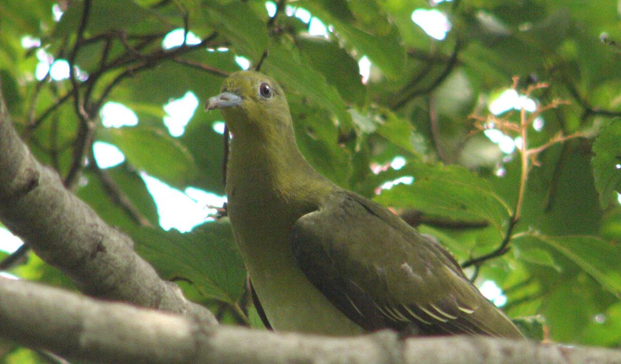 葉っぱの多い木の枝に留まるので、鳴かない限り見つけるのは困難