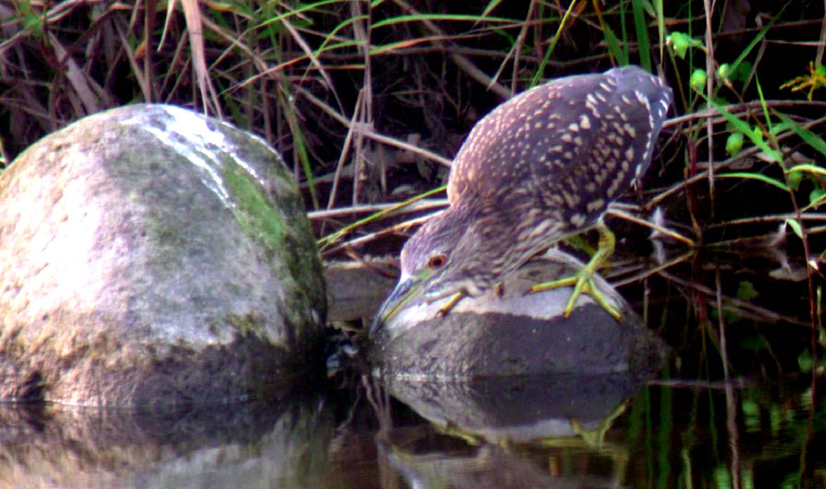 若い固体は昨日の5時過ぎに水辺で魚釣りをしていました。餌をくわえて水に投げ入れ、魚をおびき寄せているのです。3~4回繰り返していましたが失敗の様です。