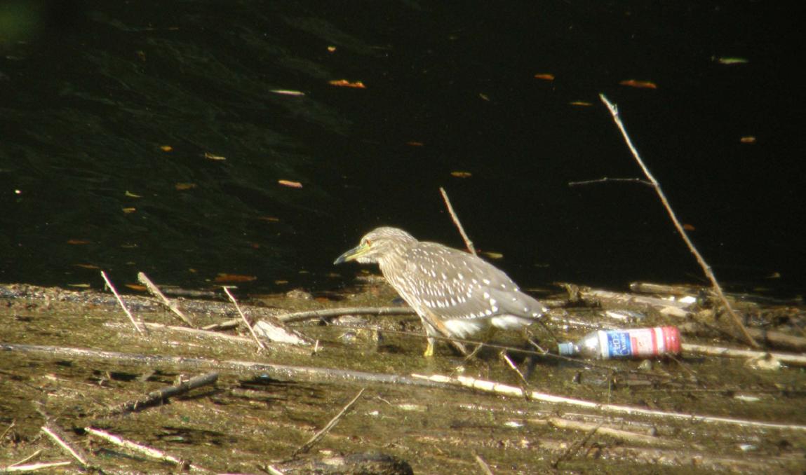 ダムに溜ったゴミの上を歩くゴイサギ・・・ペットボトル捨てたの?