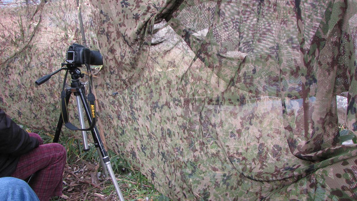 12月中旬以降は観察に行っていない、大分川のカワセミスポットへ案内しました。いつもの場所でカモフラージュネットを張って待ちましたが、一時間待ってもやってきません。うみんちゅさんが下流を偵察、いい場所があったので、そちらに基地を作る事にしました。